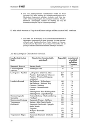 Drucksache 6/3807 Landtag Mecklenburg-Vorpommern - 6. Wahlperiode 6. Wie viele Duldungen/weitere Aufenthaltstitel wurden im Monat November 2014 nach Angaben des Ausländerzentralregisters an in Mecklenburg-Vorpommern aufhältige Ausländer erteilt (bitte dar- stellen mit Staatsangehörigkeit, der jeweiligen Anzahl der Personen, Geschlecht, Altersgruppen, Gründen der Duldung und Tag der Erstantragsstellung und Tag der Folgeantragsstellung)? Es wird auf die Antwort zu Frage 6 der Kleinen Anfrage auf Drucksache 6/3802 verwiesen. 7. Wie stellte sich die Belegung in den Gemeinschaftsunterkünften in Mecklenburg-Vorpommern im Monat November 2014 dar (bitte auf- schlüsseln nach Landkreis/kreisfreier Stadt, Standort der Gemein- schaftsunterkunft, Kapazitäten der jeweiligen Unterkünfte und der jeweiligen Zahl der monatsdurchschnittlich aufhältigen Personen)? Auf die nachfolgende Übersicht wird verwiesen. Landkreis/kreisfreie Standort der Gemeinschafts- Kapazität monatsdurch- Stadt unterkunft schnittlich aufhältige Personen Hansestadt Rostock Satower Straße 285 192 Landeshauptstadt Hamburger Allee 47 48 Schwerin Ludwigslust - Parchim Ludwigslust - Grabower Allee 263 229 Parchim - Ludwigsluster Chaussee 200 159 Parchim - Westring (Übergangs- 53 17 wohnheim) Landkreis Rostock Bad Doberan - Walkenhagen 160 136 Bad Doberan - Stülower Weg 60 52 Güstrow - Waldweg 125 104 Güstrow - Demmlerstraße 67 47 Peetsch 33 35 Kühlungsborn -Haus Kühlungsborn 60 39 Kühlungsborn - Jugendherberge 50 40 Mecklenburgische Neubrandenburg – Markscheiderweg 611 409 Seenplatte Friedland 120 106 Nordwestmecklenburg Hansestadt Wismar - Haffburg 289 256 Vorpommern - Anklam - Max-Planck-Straße 108 96 Greifswald Hansestadt Greifswald - Spiegels- 158 100 dorfer Wende Torgelow 175 155 Wolgast - Baustraße 282 262 Plöwen 60 10 Vorpommern-Rügen Hansestadt Stralsund - Dänholm 100 66 Barth 100 89 10