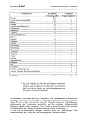 LANDTAG MECKLENBURG-VORPOMMERN Drucksache 6/3807 6. Wahlperiode 13.04.2015 KLEINE ANFRAGE des Abgeordneten David Petereit, Fraktion der NPD Asylbewerber, ehemalige Asylbewerber mit Duldung und illegale Ausländer - Monat November 2014 und ANTWORT der Landesregierung Vorbemerkung Auf die Vorbemerkung der Landesregierung zur Landtagsdrucksache 6/2180 wird verwiesen. Auf die Vorbemerkung zu den Landtagsdrucksachen 6/2180 und 6/3632 wird verwiesen. 1. Wie stellte sich in Mecklenburg-Vorpommern die Zahl der Erstantrag- steller und Folgeantragssteller für den Monat November 2014 dar (bitte aufschlüsseln nach Herkunftsländern und der jeweiligen Zahl der Antragsteller)? Auf die nachfolgende Übersicht wird verwiesen. Der Minister für Inneres und Sport hat namens der Landesregierung die Kleine Anfrage mit Schreiben vom 10. April 2015 beantwortet.