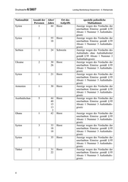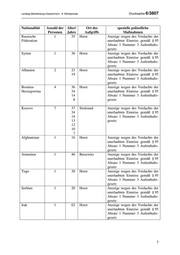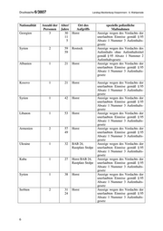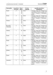 Landtag Mecklenburg-Vorpommern - 6. Wahlperiode Drucksache 6/3807 Nationalität Anzahl der Alter/ Ort des spezielle polizeiliche Personen Jahre Aufgriffs Maßnahmen Russische 1 35 Horst Anzeige wegen des Verdachts der Föderation unerlaubten Einreise gemäß § 95 Absatz 1 Nummer 3 Aufenthalts- gesetz Syrien 1 36 Horst Anzeige wegen des Verdachts der unerlaubten Einreise gemäß § 95 Absatz 1 Nummer 3 Aufenthalts- gesetz Albanien 2 23 Horst Anzeige wegen des Verdachts der 19 unerlaubten Einreise gemäß § 95 Absatz 1 Nummer 3 Aufenthalts- gesetz Bosnien- 4 36 Horst Anzeige wegen des Verdachts der Herzegowina 34 unerlaubten Einreise gemäß § 95 14 Absatz 1 Nummer 3 Aufenthalts- 8 gesetz Kosovo 7 37 Stralsund Anzeige wegen des Verdachts der 34 unerlaubten Einreise gemäß § 95 14 Absatz 1 Nummer 3 Aufenthalts- 13 gesetz 12 10 7 Afghanistan 1 16 Horst Anzeige wegen des Verdachts der unerlaubten Einreise gemäß § 95 Absatz 1 Nummer 3 Aufenthalts- gesetz Armenien 1 46 Bresewitz Anzeige wegen des Verdachts der unerlaubten Einreise gemäß § 95 Absatz 1 Nummer 3 Aufenthalts- gesetz Togo 1 38 Horst Anzeige wegen des Verdachts der unerlaubten Einreise gemäß § 95 Absatz 1 Nummer 3 Aufenthalts- gesetz Serbien 1 20 Horst Anzeige wegen des Verdachts der unerlaubten Einreise gemäß § 95 Absatz 1 Nummer 3 Aufenthalts- gesetz Irak 1 62 Horst Anzeige wegen des Verdachts der unerlaubten Einreise gemäß § 95 Absatz 1 Nummer 3 Aufenthalts- gesetz 7