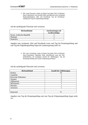 Drucksache 6/3807 Landtag Mecklenburg-Vorpommern - 6. Wahlperiode 3. Wie vielen Personen wurden im Monat November 2014 in Mecklen- burg-Vorpommern Asyl gewährt (bitte aufschlüsseln nach Asylgrund, Staatsangehörigkeit, Alter und Geschlecht, Tag der Erstantrags- stellung und Tag der Folgeantragsstellung)? Auf die nachfolgende Übersicht wird verwiesen. Herkunftsland Anerkennungen als Asylberechtigte Syrien, Arabische Republik 2 Thailand 3 Staatenlos 1 Angaben zum Asylgrund, Alter und Geschlecht sowie zum Tag der Erstantragstellung und zum Tag der Folgeantragstellung liegen der Landesregierung nicht vor. 4. Wie viele Asylanträge wurde im Monat November 2014 in Mecklen- burg-Vorpommern abgelehnt (bitte aufschlüsseln nach den Her- kunftsländern, der jeweiligen Anzahl der Ablehnungen, Tag der Erstantragsstellung und Tag der Folgeantragsstellung)? Auf die nachfolgende Übersicht wird verwiesen. Herkunftsland Anzahl der Ablehnungen Serbien 39 Ungeklärt 3 Russische Föderation 2 Ägypten 2 Afghanistan 2 Mazedonien 1 Marokko 1 Armenien 1 Insgesamt 51 Angaben zum Tag der Erstantragstellung und zum Tag der Folgeantragstellung liegen nicht vor. 8