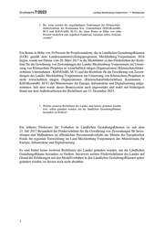 Drucksache 7/2023 Landtag Mecklenburg-Vorpommern - 7. Wahlperiode 2. Bis wann werden die angekündigten Änderungen der Klimaschutz- förderrichtlinie für Kommunen bzw. Unternehmen (KliFöKommRL M-V und KliFöUntRL M-V), die einen Bonus in Höhe von zehn Prozent zusätzlich zum regulären Fördersatz vorsehen sollen, wirksam werden? Ein Bonus in Höhe von 10 Prozent für Projektstandorte, die in Ländlichen GestaltungsRäumen (LGR) gemäß dem Landesraumentwicklungsprogramm Mecklenburg-Vorpommern 2016 liegen, wurde mit Datum vom 20. März 2017 in die Merkblätter zu den Förderhöhen der Richt- linie für die Gewährung von Zuwendungen des Landes Mecklenburg-Vorpommern zur Umset- zung von Klimaschutz-Projekten in wirtschaftlich tätigen Organisationen (Klimaschutzförder- richtlinie Unternehmen - KliFöUntRL M-V) und der Richtlinie für die Gewährung von Zuwen- dungen des Landes Mecklenburg-Vorpommern zur Umsetzung von Klimaschutz-Projekten in nicht wirtschaftlich tätigen Organisationen (Klimaschutzförderrichtlinie Kommunen - KliFöKommRL M-V) des Ministeriums für Energie, Infrastruktur und Digitalisierung aufge- nommen. Seit dem wurde dieses Bonussystem auch angewendet und endet mit bisherigem Stand mit dem Außerkrafttreten der Richtlinien am 31. Dezember 2023. 3. Welche weiteren Richtlinien des Landes sind bereits geändert worden bzw. sollen geändert werden, um die ländlichen GestaltungsRäume besonders zu fördern? Ein höherer Fördersatz für Vorhaben in Ländlichen GestaltungsRäumen ist seit dem 21. Juli 2017 Bestandteil der Förderrichtlinie für die Gewährung von Zuwendungen für Inves- titionen und Maßnahmen im öffentlichen Personennahverkehr aus Mitteln des Europäischen Fonds für regionale Entwicklung im Land Mecklenburg-Vorpommern des Ministeriums für Energie, Infrastruktur und Digitalisierung. Es sind bisher keine weiteren Richtlinien des Landes geändert worden, um die Ländlichen GestaltungsRäume besonders zu fördern. Inwieweit weitere Förderrichtlinien des Landes auf Grund der Erfahrungen mit den Modellvorhaben in den Ländlichen GestaltungsRäumen später geändert werden, ist derzeit noch nicht absehbar. 2