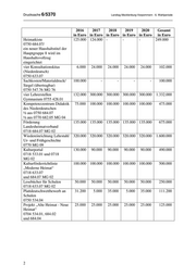 Drucksache 6/5370 Landtag Mecklenburg-Vorpommern - 6. Wahlperiode 2016 2017 2018 2019 2020 Gesamt in Euro in Euro in Euro in Euro in Euro in Euro Heimatkiste 125.000 124.000 - - - 249.000 0750 684.07/ ein neuer Haushaltstitel der Hauptgruppe 8 wird im Haushaltsvollzug eingerichtet vier Konsultationskitas 6.000 24.000 24.000 24.000 24.000 102.000 (Niederdeutsch) 0750 633.07 Sachkosten/Materialdruck/ 100.000 - - - - 100.000 Siegel (übertragbar) 0750 547.76 MG 76 vier Lehrerstellen 132.000 300.000 300.000 300.000 300.000 1.332.000 Gymnasium 0755 428.01 Kompetenzzentrum Didaktik 75.000 100.000 100.000 100.000 100.000 475.000 des Niederdeutschen ½ aus 0750 684.07 ½ aus 0770 682.05 MG 04 Förderung 135.000 135.000 135.000 135.000 135.000 675.000 Landesheimatverband 0718 684.07 MG 02 Wiedereinrichtung Lehrstuhl 320.000 320.000 320.000 320.000 320.000 1.600.000 Ur- und Frühgeschichte 0770 MG 09 Kulturportal 130.000 90.000 90.000 90.000 90.000 490.000 0718 533.01 und 0718 MG 02 Kulturförderrichtlinie 100.000 100.000 100.000 100.000 100.000 500.000 „Moderne Heimat“ 0718 633.07 und 684.07 MG 02 Lesebücher für Schulen 50.000 50.000 50.000 50.000 50.000 250.000 0718 633.07 MG 02 Plattdeutschwettbewerb an 31.200 5.000 35.000 5.000 35.000 111.200 Schulen 0750 534.04 Projekt „Alte Heimat - Neue 25.000 25.000 25.000 25.000 25.000 125.000 Heimat“ 0704 534.01, 684.02 und 684.04 2