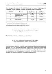 Landtag Mecklenburg-Vorpommern - 7. Wahlperiode Drucksache 7/53 Die wichtigsten Branchen in der GRW-Förderung der letzten Legislaturperiode (September 2011 bis September 2016) nach geschaffenen Dauerarbeitsplätzen NACE-Code Branche Geschaffene Gesicherte Arbeitsplätze Arbeitsplätze* 10 Herstellung von Nahrungs- 1.194,00 4.743,56 und Futtermitteln 55 Beherbergung 747,43 1.736,63 28 Maschinenbau 527,00 3.268,65 * einschließlich Mehrfachzählung bei Mehrfachförderung Ein branchenbezogener Ländervergleich liegt nicht vor. 3. Wenn in den Fragen 1 und 2 keine Kenntnisse vorliegen, ist es geplant, eine derartige Überprüfung vorzunehmen? Es wird auf die Antworten zu den Fragen 1 und 2 verwiesen. 4. Setzt sich die Landesregierung beim Bund dafür ein, dass die Bean- tragung von EU-Fördermitteln vereinfacht wird und wenn ja, wie? Die Anforderungen an die EU-Förderung werden weitgehend von europäischen Regularien bestimmt. Das Land setzt sich daher sowohl beim Bund als auch bei der Europäischen Kommission dafür ein, dass die Umsetzung der EU-Förderung vereinfacht wird. Hierzu nutzt sie zum Beispiel Bund-Länder-Abstimmungstreffen, die regelmäßigen Gespräche zwischen den Bundesländern und der Europäischen Kommission, aber auch die bilaterale Kommuni- kation mit dem Bund beziehungsweise der Europäischen Kommission. 3