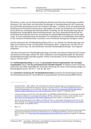 Wissenschaftliche Dienste Kurzinformation Seite 2 Zur Berücksichtigung der Sustainable Development Goals im Regierungs- und Verwaltungshandeln Wie bereits in dem von den Wissenschaftlichen Diensten des Deutschen Bundestages erstellten Sachstand „Die Aktivitäten des Deutschen Bundestages in Zusammenhang mit der Umsetzung der Sustainable Development Goals der Vereinten Nationen“ erwähnt, ist für die Beachtung der 3 Einhaltung und Weiterentwicklung dieser Zielvorgabe auf Seiten des Parlaments der Parlamenta- rische Beirat für nachhaltige Entwicklung (PBnE) zuständig. Bei der Bundesregierung liegt die 4 federführende Zuständigkeit beim Bundeskanzleramt, dort beim Staatssekretärsausschuss für nachhaltige Entwicklung. Durch die Anwendung der Nachhaltigkeitsprüfung soll sowohl regie- rungs- als auch parlamentsseitig das Entstehen von Inkohärenzen zur nachhaltigen Entwicklung in den einzelnen Politikbereichen vermieden sowie bestehende Divergenzen korrigiert werden. Auf das Instrument der Nachhaltigkeitsprüfung wird u.a. im „Bericht der Bundesregierung zum High-Level Political Forum on Sustainable Development 2016“ hingewiesen, der den VN vor- 5 liegt. Dort wird in Kap. 1b) „Die bestehende nationale Nachhaltigkeitsstrategie“ das Folgende ausgeführt: „Mit dem Instrument der Nachhaltigkeitsprüfung wird jeder Vorschlag der Regierung für Gesetze und Rechtsverordnungen anhand der Ziele, Indikatoren und Managementregeln der nationalen Nachhaltigkeitsstrategie daraufhin geprüft, welche Auswirkungen auf die nachhaltige Entwick- lung zu erwarten sind.“ 6 Die Nachhaltigkeitsprüfung ist somit als permanenter Prozess implementiert, der das Regie- rungshandeln ebenso wie das parlamentarische Handeln begleitet. Im Rahmen dieses Prozesses unterrichtet der PBnE regelmäßig den Deutschen Bundestag. Die letzte Unterrichtung erfolgte mit Bundestagsdrucksache 18/12511 vom 26. Mai 2017. 7 Zur nationalen Umsetzung der Nachhaltigkeitsstrategie kooperiert die Bundesregierung über das Bundesministerium für wirtschaftliche Zusammenarbeit und Entwicklung (BMZ) mittels 3 Sachstand WD 2 – 3000 - 090/16 „Die Aktivitäten des Deutschen Bundestages in Zusammenhang mit der Umsetzung der Sustainable Development Goals der Vereinten Nationen“ der Wissenschaftlichen Dienste des Deutschen Bundestages vom 12. Juli 2016. Abrufbar unter: https://www.bundestag.de/blob/438634/0692a 5566291ca4db01d3054fabb4395/wd-2-090-16-pdf-data.pdf (letzter Zugriff: 27. September 2017). 4 Antrag der Fraktionen CDU/CSU, SPD, DIE LINKE. und BÜNDNIS 90/DIE GRÜNEN auf „Einsetzung des Parla- mentarischen Beirats für nachhaltige Entwicklung“ (BT-Drs. 18/559 vom 19. Februar 2014). Abrufbar unter: http://dip21.bundestag.btg/dip21/btd/18/005/1800559.pdf (letzter Zugriff. 18. September 2017). 5 Bericht der Bundesregierung zum High-Level Political Forum on Sustainable Development 2016 vom 12. Juli 2016. Abrufbar unter: https://www.bmz.de/de/zentrales_downloadarchiv/Presse/HLPF-Bericht_final_DE.pdf (letzter Zugriff. 18. September 2017). 6 Ebd., S. 7. 7 Unterrichtung durch den Parlamentarischen Beirat für nachhaltige Entwicklung: Bericht des parlamentarischen Beirates für nachhaltige Entwicklung (Arbeitsbericht der 18. Wahlperiode) (BT-Drs. 18/12511 vom 26. Mai 2017). Abrufbar unter: http://dip21.bundestag.btg/dip21/btd/18/125/1812511.pdf (letzter Zugriff. 18. September 2017). Fachbereich WD 2 Auswärtiges, Völkerrecht, wirtschaftliche Zusammenarbeit und Entwicklung, Verteidigung, Menschenrechte und Humanitäre Hilfe