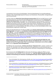 Wissenschaftliche Dienste Kurzinformation Seite 3 Zur Berücksichtigung der Sustainable Development Goals im Regierungs- und Verwaltungshandeln verschiedener Foren (Forum Nachhaltigkeit , Wissenschaftsplattform ) mit gesellschaftlichen 8 9 Akteuren. Diese Nachhaltigkeitspartner kommen aus Kommunen, Wissenschaft, Zivilgesellschaft und Privatwirtschaft. Auf dem Gebiet der bilateralen Entwicklungszusammenarbeit (EZ) hat das BMZ bereits im Jahr 2016 damit begonnen, die deutsche Entwicklungspolitik systematisch auf die Umsetzung der Agenda 2030 auszurichten. Dazu gehört die Überprüfung und Ausrichtung aller Verfahren, In- strumente und Sektoransätze daraufhin, wie sie einen gezielten Beitrag zur Umsetzung nach- haltiger Entwicklung im Sinne der Agenda 2030 leisten können. Beispielsweise soll mit Hilfe einer periodischen Portfolioüberprüfung eruiert werden, wie die entwicklungspolitische Zu- sammenarbeit mit den Partnerländern des BMZ noch besser auf die Erreichung der SDG in den Partnerländern ausgerichtet werden kann. Seitens der Bundesregierung wird über das BMZ auch externer Sachverstand zur Evaluierung der EZ generiert. So wurde u.a. das Deutsche Evaluierungsinstitut der Entwicklungszusammen- arbeit (DEval) vom BMZ mandatiert und legt entsprechende Prüfberichte dem BMZ vor, die 10 dann ggf. Gegenstand der Aussprache im Ausschuss für wirtschaftliche Zusammenarbeit und Entwicklung werden. Eine Übersicht über die Stellungnahmen des BMZ zu den vom DEval er- stellten Berichten sind über http://www.bmz.de/de/ministerium/evaluierung/ergebnisse/evaluie- rungsberichte-stellungnahmen/index.html abrufbar. International gestaltet die deutsche Entwicklungspolitik die internationale Politik für nach- haltige Entwicklung mit. Das BMZ trägt aktiv dazu bei, die Reformen der multilateralen Organi- sationen im Sinne der Agenda 2030 weiter voranzubringen, insbesondere die der VN, der Welt- bank und der regionalen Entwicklungsbanken. Das BMZ hat das transnationale „Partners for Review“-Netzwerk (P4R) initiiert, welches auch 11 von den VN unterstützt wird. Damit werden Entwicklungsländer bei der Berichterstattung im HLPF zur Agenda 2030 sowie die Entwicklung einer nationalen Überprüfung der Umsetzung un- terstützt. Für die kommende 19. Wahlperiode des Deutschen Bundestages schlägt der PBnE in seiner Unterrichtung an das Parlament vom 26. Mai 2017 vor, „dass der PBnE die bereits für 2018 an- stehende Fortschreibung der Deutschen Nachhaltigkeitsstrategie intensiv begleitet und hierzu 8 Forum Nachhaltigkeit. Hg.: Bundesregierung. Abrufbar unter: https://www.bundesregierung.de/Content/DE/Fo- toreihe/2017/2017-16-15-forum-nachhaltigkeit/2017-16-15-forum-nachhaltigkeit.html (letzter Zugriff. 27. Sep- tember 2017). 9 Wissenschaftsplattform Nachhaltigkeit 2030. Hg.: Institut für transformative Nachhaltigkeitsforschung. Abrufbar unter: http://www.iass-potsdam.de/de/forschung/nachhaltigkeitsziele (letzter Zugriff. 27. September 2017). 10 Homepage des Deutschen Evaluierungsinstituts der Entwicklungszusammenarbeit (DEval). Abrufbar unter: https://www.deval.org/de/ (letzter Zugriff. 18. September 2017). 11 Homepage des Netzwerks Partners for Review. Abrufbar unter: http://www.partners-for-review.de (letzter Zu- griff. 27. September 2017). Fachbereich WD 2 Auswärtiges, Völkerrecht, wirtschaftliche Zusammenarbeit und Entwicklung, Verteidigung, Menschenrechte und Humanitäre Hilfe