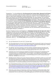 Wissenschaftliche Dienste Ausarbeitung Seite 51 WD 10 - 3000 - 095/12 festgehalten. Im darauffolgenden Trio-Programm der Vorsitze Polen, Dänemark und Zypern 177 (2011/2012) wird betont, dass sich die EU sich bei der internationalen Bekämpfung des Do- pings im Sport besser einbringen soll (Rats-Dokument 11447/11, 17.6.11). Bereits im Jahr 2007 gab es eine Initiative der Deutschen Ratspräsidentschaft, die darauf abzielte, die nationalen Anti-Doping-Organisationen (NADOs) auf der Ebene der Europäischen Union besser miteinan- der zu vernetzen und ein Kommunikationsnetzwerk aufzubauen. Wesentliches Ziel war (und 178 ist weiterhin) die Einrichtung eines EU-Netzwerkes von nationalen Anti-Doping-Agenturen 179 sowie eine auf EU-Ebene agierende Doping-Monitoring-Task-Force. Vorgesehen war außerdem ein regelmäßiger informeller Austausch und verbesserte Zusammenarbeit in den Bereichen Doping-Testsystem, Medizin, Forschung, Prävention, Recht sowie die Kooperation der NADOs mit staatlichen Stellen, Sportverbänden und der EU-Kommission. Angestrebt wurde180 außerdem, das Testsystem EU-weit zu optimieren und die internationale Zusammenarbeit im Kampf gegen Doping zu verstärken. 181 Konkrete Vorgehensweisen sind festgelegt im Arbeitsplan des Rats für den Sport 2011-2014. 182 Vorgesehen ist dort auch die Ausarbeitung eines Entwurfs von Bemerkungen der EU zur Über- arbeitung des Antidoping-Codes der WADA. Am 4. Oktober 2012 hat der Ministerrat dazu einen weiteren Beitrag der EU zur Überarbeitung des WADA-Codes gebilligt (Rats-Dokument 14204/12), nachdem bereits im März 2012 erste Vorschläge unterbreitet worden sind (Rats- Dokument 1404/12). Der WADA-Code soll bis zum Jahr 2015 in mehreren Phasen 183 177 Vgl. dazu Ratsdokument 16771/09 vom 27. November 2009. 178 Vgl. Schlussfolgerungen des Vorsitzes der EU-Ratspräsidentschaft vom Informellen Treffen der Sportminister der Europäischen Union vom 12. bis 13. März 2007 in Stuttgart („Stuttgarter Schlussfolgerungen“), abrufbar unter http://ec.europa.eu/sport/library/documents/b21/doc458_de.pdf. 179 Ein offizielles, durch die EU getragenes, Netzwerk nationaler Anti-Doping-Agenturen kam bisher nicht zustande. Wie weit die Initiative gediehen ist, wird etwa dokumentiert in einer Podiums-Diskussion von Doping-Experten und Vertretern nationaler Anti-Doping-Agenturen (BLUMENTHAL 2010: 83ff.). 180 Angestrebt wird von der EU-Kommission außerdem ein Mandat des Ministerrats für Verhandlungen über einen Beitritt der EU zur Antidopingkonvention des Europarates. In der Mitteilung „Entwicklung der europäischen Dimension des Sports“ heißt es: „Es ist zu prüfen, welche Wirkung die durch Artikel 165 AEUV festgelegte Zuständigkeit der Union für eine eventuelle Beteiligung der EU an den Leitungsstrukturen der WADA hat.“ (KOM(2011)12, 18.1.11: 4f.). 181 Bekräftigt wird das Anliegen auch in einem Antrag der Fraktionen von CDU/CSU und CSU vom 16. Juni 2010. Die Bundesregierung wird darin aufgefordert, den Kampf gegen Doping im Sport durch die Einrichtung eines Netzwerkes der europäischen Anti-Doping-Organisationen (NADOs) sowie einer „Monitoring-Task-Force“ zu unterstützen (BT-Drs. 17/2129); der Antrag wurde in der Plenarsitzung vom 8. Juli 2010 angenommen (Plenarprotokoll 17/55; Beschlussempfehlung und Bericht des Sportausschusses, BT-Drs. 17/2468, 7.7.10). 182 Vgl. die Entschließung des Rates und der im Rat vereinigten Vertreter der Regierungen der Mitgliedstaaten zu einem Arbeitsplan der Europäischen Union für den Sport (2011-2014) (EU-ABl. C 162/1, 1.6.11), abrufbar unter http://eur-lex.europa.eu/LexUriServ/LexUriServ.do?uri=OJ:C:2011:162:0001:0005:de:PDF. Vgl. dazu auch den Bericht der Experten-Gruppe „Anti-Doping“ vom 3. Treffen im September 2012, abrufbar unter http://ec.europa.eu/sport/library/documents/b24/xg-ad-201209-final-rpt.pdf. 183 Dabei geht es nicht zuletzt um die Regelungen mit Bezug zu Datenschutz und freiem Datenverkehr. Hierzu wurde auf Ratsebene im Februar 2012 von der Gruppe „Sport“ auf Ersuchen des Vorsitzes ein Beitrag der Europäischen Union zur ersten Phase des Überarbeitungsprozesses des WADA-Codes erstellt. Grundlage ist