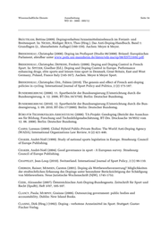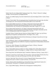 Wissenschaftliche Dienste Ausarbeitung Seite 54 WD 10 - 3000 - 095/12 BRÄUTIGAM, Bettina (2009). Dopingverhalten/Arzneimittelmissbrauch im Freizeit- und Breitensport. In: NICKEL, Rüdiger; ROUS, Theo (Hrsg.). Das Anti-Doping-Handbuch. Band 1: Grundlagen (2., überarbeitete Auflage) (160-159). Aachen: Meyer & Meyer. BRISSONNEAU, Christophe (2008). Doping im Profisport (Studie 06/2008). Brüssel: Europäisches Parlament, abrufbar unter www.pedz.uni-mannheim.de/daten/edz-ma/ep/08/EST21692.pdf. BRISSONNEAU, Christophe; DEPIESSE, Frederic (2006). Doping and Doping Control in French Sport. In: SPITZER, Giselher (Ed.). Doping and Doping Control in Europe. Performance enhancing drugs, elite sports and leisure time sport in Denmark, Great Britain, East and West Germany, Poland, France Italy (145-167). Aachen. Meyer & Meyer Sport. BRISSONNEAU, Christophe; OHL, Fabien (2010). The genesis and effect of French anti-doping policies in cycling. International Journal of Sport Policy and Politics, 2 (2) 173-187. BUNDESREGIERUNG (2006). 11. Sportbericht der Bundesregierung (Unterrichtung durch die Bundesregierung, 4. 12. 2006, BT-Drs.16/3750). Berlin: Deutscher Bundestag. BUNDESREGIERUNG (2010). 12. Sportbericht der Bundesregierung (Unterrichtung durch die Bun- desregierung, 3. 09. 2010, BT-Drs.17/2880). Berlin: Deutscher Bundestag. BÜRO FÜR TECHNIKFOLGEN-ABSCHÄTZUNG (2008). TA-Projekt: Gendoping (Bericht des Ausschus- ses für Bildung, Forschung und Technikfolgenabschätzung, BT-Drs. Drucksache 16/9552 vom 12. 06. 2008). Berlin: Deutscher Bundestag. CASINI, Lorenzo (2009). Global Hybrid Public-Private Bodies: The World Anti-Doping Agency (WADA), International Organizations Law Review, 6 (2) 421-446. CHAKER, André-Noël (1999). Study of national sports legislation in Europe. Strasbourg: Council of Europe Publishing. CHAKER, André-Noël (2004). Good governance in sport - A European survey. Strasbourg: Council of Europe Publishing. CHAPPELET, Jean-Loup (2010). Switzerland. International Journal of Sport Policy, 2 (1) 99-110. CHERKEH, Rainer; MOMSEN, Carsten (2001). Doping als Wettbewerbsverzerrung? Möglichkeiten der strafrechtlichen Erfassung des Dopings unter besonderer Berücksichtigung der Schädigung von Mitbewerbern. Neue Juristische Wochenschrift (NJW), 1745-1752. CIZEK, Alexander (2007). Österreichisches Anti-Doping-Bundesgesetz. Zeitschrift für Sport und Recht (SpuRt), Heft 3/07, 105-107. CLANCY, Paula; MURPHY, Grainne (2006). Outsourcing government: public bodies and accountability, Dublin: New Island Books. CLASING, Dirk (Hrsg.) (1992). Doping - verbotene Arzneimittel im Sport. Stuttgart: Gustav Fischer Verlag.