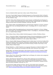 Wissenschaftliche Dienste Ausarbeitung Seite 56 WD 10 - 3000 - 095/12 FEIDEN, Karl; BLASIUS, Helga (2008). Doping im Sport. Wer – Womit – Warum (2. Auflage). Stuttgart: Wissenschaftliche Verlagsgesellschaft. FIGURA, Lars (2009). Doping. Zwischen Freiheitsrecht und notwendigem Verbot. Aachen: Meyer & Meyer. FISCHER, Ulrich (2005). Über den galoppierenden Unschuldsverlust des Sports oder: Die Welt will betrogen sein. Neue Juristische Wochenschrift (NJW), 58 (15) 1028-1029. FRANZ, Birgit (2008). Russland. In: IAT (Hrsg.): Olympische Sommerspiele 2008. Zur Entwicklung der nationalen Spitzensportkonzepte der USA, Chinas, Russlands, Großbritanniens und Australiens im Olympiazyklus 2004-2008. Leipzig: IAT, S. 19-58. FRANZ, Birgit (2010). Russland. In: IAT (Hrsg.): Olympische Winterspiele 2010. Zur Entwicklung der nationalen Spitzensportkonzepte Kanadas, Norwegens, Russlands und der USA im Olympiazyklus 2006-2010. Leipzig: IAT, S. 115-170. GARDINER, Simon; PARRISH, RICHARD; SIEKMANN; Robert (2009). EU, Sport, Law and Policy: Regulation, Re-regulation and Representation. The Hague: T.M.C. Asser. GLOCKER, Moritz (2009). Die strafrechtliche Bedeutung von Doping: de lege lata und de lege ferenda, Frankfurt: Peter Lang. GÖRTZ, Reinhard J. (2012). Anti-Doping-Maßnahmen im Hochleistungssport aus rechtlicher Sicht: Zur Ausgestaltung einer effektiven Compliance-Organisation in Deutschland, Remscheid: Gardez! Verlag. GUTTMANN, Allen; Thompson, Lee (2001): Japanese Sports: A History. illustrated edition. Honolulu: University of Hawai'i Press. HAAS, Ulrich (2009). Doping und Recht. In: NICKEL, Rüdiger; ROUS, Theo (Hrsg.). Das Anti- Doping-Handbuch. Band 1: Grundlagen (2. Auflage) (199-213). Aachen: Meyer & Meyer. HAHN, Jörg (2010). Der überfrachtete Sport. Frankfurter Allgemeine Zeitung, 2. Januar 2010, 1. HAMILTON, Tyler/COYLE, Daniel (2012). The Secret Race. Inside the Hidden World of the Tour de France: Doping, Cover-ups, and Winning at All Costs, New York: Bantam. HANSTAD, Dag Vidar; SKILLE, Eivind Å.; LOLAND, Sigmund (2010). Harmonization of anti- doping work: myth or reality? In: Sport in Society, 13 (3) 418-430. HARING, Merten (2010). Sportförderung in Deutschland. Eine vergleichende Analyse der Bundesländer. Wiesbaden: VS Verlag für Sozialwissenschaften. HAUG, Tanja (2006). Doping – Dilemma des Leistungssports. Hamburg: Merus.