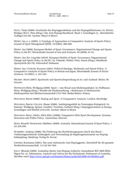 Wissenschaftliche Dienste Ausarbeitung Seite 57 WD 10 - 3000 - 095/12 HAUG, Tanja (2009). Geschichte des Dopinggeschehens und der Dopingdefinitionen. In: N ICKEL, Rüdiger; ROUS, Theo (Hrsg.). Das Anti-Doping-Handbuch. Band 1: Grundlagen (2., überarbeitete Auflage) (34-49). Aachen: Meyer & Meyer. HENRY, Ian u. a. (2005). A Typology of Approaches to Comparative Analysis of Sports Policy. Journal of Sport Management (JSM), 19 (2005), 480-496. HENRY, Ian (2009). European Models of Sport: Governance, Organisational Change and Sports Policy in the EU. Hitotsubashi Journal of Arts and Sciences, 50 (2009), 41-52. HENRY, Ian; KO, Ling-Mei (2010). European Models of Sport: Governance, Organisational Change and Sports Policy in the EU. In: Tokarski, Walter; Petry, Karen (Hrsg.): Handbuch Sportpolitik (63-79). Schorndorf: Hofmann. HENRY, Ian; UCHIUMI, Kuwano (2001). Political Ideology, Modernity and Sports Policy: A Comparative Analysis of Sports Policy in Britain and Japan. Hitotsubashi Journal of Social Sciences, 33 (2001), 2, 161-185. HILPERT, Horst (2007). Sportrecht und Sportrechtsprechung im In- und Ausland. Berlin: De Gruyter. HOFFMANN-RIEM, Wolfgang (2009). Sport – vom Ritual zum Medienspektakel. In: Hoffmann- Riem, Wolfgang (Hrsg.). Wandel der Medienordnung – Reaktionen in Medienrecht, Medienpolitik und Medienwissenschaft (753-764). Baden-Baden: Nomos. HOULIHAN, Barrie (2006). Doping and Sport. A Comparative Analysis. London: Routledge. HOULIHAN, Barrie; COLLINS, Shane (2006). Antidopingpolitik im Vereinigten Königreich. In: Knörzer, Wolfgang; Spitzer, Giselher; Treutlein, Gerhard (Hrsg.). Dopingprävention in Europa. Grundlagen und Modell (210-216). Aachen: Meyer & Meyer. HOULIHAN, Barry; GREEN, Mick (Eds.) (2008). Comparative Elite Sport Development. Systems, Structures and Public Policy. Amsterdam: Elsevier. HOYE, Russell; NICHOLSON, Matthew (2009). Australia. International Journal of Sport Policy, 1 (2) 229-240. HUMBERG, Andreas (2006). Die Förderung des Hochleistungssports durch den Bund – Verfassungsrechtliche Zulässigkeit und Verwendung als Regelungsinstrument zur Doping- bekämpfung. Hamburg: Verlag Dr. Kovač. JARVERS, Konstanze (2001). Das neue italienische Anti-Dopinggesetz. Zeitschrift für die gesamte Strafrechtswissenschaft, 113 (4) 947-954. JOLLY, Rhonda (2009). Australian Sports Anti-Doping Authority Amendment Bill 2009 (Bills Digest No. 41, Information, Analysis and Advice for the Parliament), Parliament of Australia, abrufbar unter http://www.aph.gov.au/binaries/library/pubs/bd/2009-10/10bd041.pdf.
