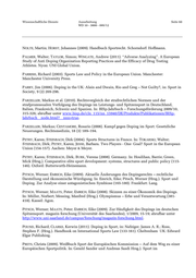 Wissenschaftliche Dienste Ausarbeitung Seite 60 WD 10 - 3000 - 095/12 NOLTE, Martin; HORST, Johannes (2009). Handbuch Sportrecht. Schorndorf: Hoffmann. PALMER, Walter; TAYLOR, Simon; WINGATE, Andrew (2011). “Adverse Analyzing”. A European Study of Anti Doping Organization Reporting Practices and the Efficacy of Drug Testing Athletes. Nyon: UNI Global Union. PARRISH, Richard (2003). Sports Law and Policy in the European Union. Manchester: Manchester University Press. PARRY, Jim (2006). Doping in the UK: Alain and Dwain, Rio and Greg – Not Guilty?, in: Sport in Society, 9 (2) 269-296. PARZELLER, Markus et al. (2010). Rechtsvergleich der strafrechtlichen Normen und der strafprozessualen Verfolgung des Dopings im Leistungs- und Spitzensport in Deutschland, Italien, Frankreich, Schweiz und Spanien. In: BISp-Jahrbuch – Forschungsförderung 2009/10, 315-326; abrufbar unter www.bisp.de/cln_115/nn_15940/DE/Produkte/Publikationen/BISp- Jahrbuch__node.html?__nnn=true. PARZELLER, Markus; CENTAMORE, Rosario (2008). Kampf gegen Doping im Sport. Gesetzliche Neuerungen. Rechtsmedizin, 18 (3) 189–194. PETRY, Karen; STEINBACH, Dirk (2004). Sports Structures in France. In: TOKARSKI, Walter; STEINBACH, Dirk; PETRY, Karen; JESSE, Barbara. Two Players - One Goal? Sport in the European Union (154-157). Aachen: Meyer & Meyer. PETRY, Karen; STEINBACH, Dirk; BURK, Verena (2008). Germany. In: Houlihan, Barrie; Green, Mick (Hrsg.). Comparative elite sport development: systems, structures and public policy (115- 146). Oxford: Butterworth-Heinemann. PITSCH, Werner; EMRICH, Eike (2009). Aktuelle Änderungen des Dopingsrechts – rechtliche Darstellung und ökonomische Würdigung. In: Emrich, Eike; Pitsch, Werner (Hrsg.). Sport und Doping. Zur Analyse einer antagonistischen Symbiose (165-180). Frankfurt: Lang. PITSCH, Werner; MAATS, Peter; EMRICH, Eike (2008). Skizzen zu einer Ökonomik des Dopings. In: Müller, Norbert; Messing, Manfred (Hrsg.). Olympismus – Erbe und Verantwortung (381- 418). Kassel: Agon. PITSCH, Werner; MAATS, Peter; EMRICH, Eike (2009). Zur Häufigkeit des Dopings im deutschen Spitzensport. magazin forschung (Universität des Saarlandes), 1/2009, 15-19; abrufbar unter http://www.uni-saarland.de/campus/forschung/magazin-forschung.html. POUND, Richard; CLARKE, Kerwin (2011). Doping in Sport, in: Nafziger, James A. R.; Ross, Stephen F. (Hrsg.). Handbook on International Sports Law (133-161). Cheltenham UK: Edward Elgar Publishing. PRETS, Christa (2009). Weißbuch Sport der Europäischen Kommission – Auf dem Weg zu einer Europäischen Sportpolitik. In: Gerald Sander und Andreas Sasdi Hrsg.). Sport im