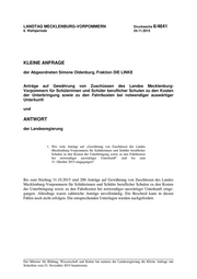 LANDTAG MECKLENBURG-VORPOMMERN Drucksache 6/4641 6. Wahlperiode 24.11.2015 KLEINE ANFRAGE der Abgeordneten Simone Oldenburg, Fraktion DIE LINKE Anträge auf Gewährung von Zuschüssen des Landes Mecklenburg- Vorpommern für Schülerinnen und Schüler beruflicher Schulen zu den Kosten der Unterbringung sowie zu den Fahrtkosten bei notwendiger auswärtiger Unterkunft und ANTWORT der Landesregierung 1. Wie viele Anträge auf „Gewährung von Zuschüssen des Landes Mecklenburg-Vorpommern für Schülerinnen und Schüler beruflicher Schulen zu den Kosten der Unterbringung sowie zu den Fahrtkosten bei notwendiger auswärtiger Unterkunft“ sind bis zum 31. Oktober 2015 eingegangen? Bis zum Stichtag 31.10.2015 sind 200 Anträge auf Gewährung von Zuschüssen des Landes Mecklenburg-Vorpommern für Schülerinnen und Schüler beruflicher Schulen zu den Kosten der Unterbringung sowie zu den Fahrtkosten bei notwendiger auswärtiger Unterkunft einge- gangen. Allerdings waren zahlreiche Anträge unvollständig. Ein Bescheid kann in diesen Fällen noch nicht erfolgen. Die entsprechenden Unterlagen wurden nachgefordert. Der Minister für Bildung, Wissenschaft und Kultur hat namens der Landesregierung die Kleine Anfrage mit Schreiben vom 23. November 2015 beantwortet.