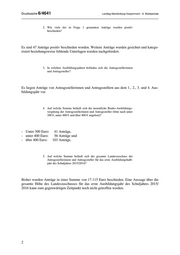 Drucksache 6/4641 Landtag Mecklenburg-Vorpommern - 6. Wahlperiode 2. Wie viele der in Frage 1 genannten Anträge wurden positiv beschieden? Es sind 47 Anträge positiv beschieden worden. Weitere Anträge wurden gesichtet und katego- risiert beziehungsweise fehlende Unterlagen wurden nachgefordert. 3. In welchen Ausbildungsjahren befinden sich die Antragsstellerinnen und Antragssteller? Es liegen Anträge von Antragsstellerinnen und Antragsstellern aus dem 1., 2., 3. und 4. Aus- bildungsjahr vor. 4. Auf welche Summe beläuft sich die monatliche Brutto-Ausbildungs- vergütung der Antragsstellerinnen und Antragssteller (bitte nach unter 300 €, unter 400 € und über 400 € angeben)? - Unter 300 Euro: 41 Anträge, - unter 400 Euro: 56 Anträge und - über 400 Euro: 103 Anträge. 5. Auf welche Summe beläuft sich der gesamte Landeszuschuss der Antragsstellerinnen und Antragssteller für das erste Ausbildungshalb- jahr des Schuljahres 2015/2016? Bisher wurden Anträge in einer Summe von 17.115 Euro beschieden. Eine Aussage über die gesamte Höhe des Landeszuschusses für das erste Ausbildungsjahr des Schuljahres 2015/ 2016 kann zum gegenwärtigen Zeitpunkt noch nicht getroffen werden. 2