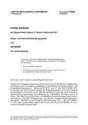 LANDTAG MECKLENBURG-VORPOMMERN Drucksache 7/2448 7. Wahlperiode 07.08.2018 KLEINE ANFRAGE des Abgeordneten Stephan J. Reuken Fraktion der AfD Bürger- und Gemeindenbeteiligungsgesetz und ANTWORT der Landesregierung Zur Antwort auf die Kleine Anfrage „Bürger- und Gemeindenbeteiligungs- gesetz - Mitverdienst an Windkraftanlagen“ Drucksache 7/490 ergeben sich Nachfragen. 1. Wie ist der aktuelle Sachstand? 2. Wie beantwortet die Landesregierung die Fragen 1 bis 5 aus der oben genannten Kleinen Anfrage aus heutiger Sicht? Die Fragen 1 und 2 werden zusammenhängend beantwortet. Aufgrund der Übergangsregelung nach § 16 des Gesetzes über die Beteiligung von Bürgerinnen und Bürgern sowie Gemeinden an Windparks in Mecklenburg-Vorpommern (Bürger- und Gemeindenbeteiligungsgesetz - BüGembeteilG M-V) vom 18. Mai 2016 (GVOBl. M-V, S. 258) findet das Gesetz keine Anwendung auf Windenergieanlagen, die bis zum Zeitpunkt des Inkrafttretens des Gesetzes am 28. Mai 2016 genehmigt wurden oder deren immissions- schutzrechtliche Genehmigung unter Beifügung der vollständigen Unterlagen nach § 10 Absatz 1 Satz 2 des Gesetzes zum Schutz vor schädlichen Umwelteinwirkungen durch Luftver- unreinigungen, Geräusche, Erschütterungen und ähnliche Vorgänge (Bundes-Immissions- schutzgesetz - BImSchG) in der Fassung der Bekanntmachung vom 17. Mai 2013 (BGBl. I S. 1274), zuletzt geändert durch Artikel 3 des Gesetzes vom 18. Juli 2017 (BGBl. I S. 2771), zu diesem Zeitpunkt beantragt wurde. Der Minister für Energie, Infrastruktur und Digitalisierung hat namens der Landesregierung die Kleine Anfrage mit Schreiben vom 6. August 2018 beantwortet.