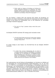 Landtag Mecklenburg-Vorpommern - 7. Wahlperiode Drucksache 7/3187 5. Welche Anzahl von Anträgen auf Gewährung von Zuschüssen des Landes Mecklenburg-Vorpommern für Schülerinnen und Schüler beruflicher Schulen zu den Kosten der Unterbringung sowie zu den Fahrtkosten bei notwendiger auswärtiger Unterkunft ist im Schuljahr 2018/2019 bis zum Stichtag 2. Februar 2019 eingegangen? Bis zum Stichtag 2. Februar 2019 sind insgesamt 658 Anträge auf Gewährung von Zuschüssen des Landes Mecklenburg-Vorpommern für Schülerinnen und Schuler beruflicher Schulen zu den Kosten der Unterbringung sowie zu den Fahrtkosten bei notwendiger auswärtiger Unterkunft eingegangen. 6. Wie viele der in Frage 5 genannten Anträge wurden bisher positiv beschieden? Im Schuljahr 2018/2019 sind bisher 202 Anträge positiv beschieden worden 7. Auf welche Summe beläuft sich derzeit der Landeszuschuss zugunsten der Antragsstellerinnen und Antragssteller im Schuljahr 2018/2019 (Stichtag 2. Februar 2019)? Es wurden Anträge in einer Summe von 136.218,88 Euro für das Schuljahr 2018/2019 beschieden. 8. In welcher Form wird die Landesregierung ihre seit mehr als zwei Jahren andauernde Prüfung der Rechtmäßigkeit von Zuschüssen im Hinblick auf die Entscheidung des Verwaltungsgerichtshofes Baden-Württemberg vom 28. Juni 2016 (Az. 9 S 1906/14) zu Auswir- kungen auf die Bedarfslage in Mecklenburg-Vorpommern bei Beför- derungs- und Unterkunftskosten von Berufsschülerinnen und Berufs- schülern mit dem Ziel eines Ergebnisses weiter fortführen? Die Landesregierung wird die Prüfung der Rechtmäßigkeit von Zuschüssen im Hinblick auf die Entscheidung des Verwaltungsgerichtshofes Baden-Württemberg vom 28. Juni 2016 (Az. 9 S 1906/14) zu Auswirkungen auf die Bedarfslage in Mecklenburg-Vorpommern bei Beförderungs- und Unterkunftskosten von Berufsschülerinnen und Berufsschülern in Form einer rechtlichen Be- und Auswertung der in der benannten Entscheidung durch das Gericht getroffenen grundlegenden und landesrechtspezifischen rechtlichen Ausführungen weiter fortführen. Zuletzt wurde das Thema in der Sitzung des Ausschusses für Berufsbildung der Kultusministerkonferenz (KMK) am 13. und 14. Dezember 2018 erörtert. 3