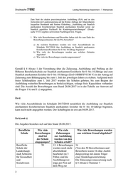 Landtag Mecklenburg-Vorpommern - 7. Wahlperiode Drucksache 7/992 2. Wie stellen sich die Schülerinnen/Schüler bzw. Auszubildenden, die im Schuljahr 2017/2018 ihre Ausbildung zu Staatlich anerkannten Erzie- herinnen/Erziehern für 0- bis 10-Jährige beginnen, nach Alters- kohorten, Geschlecht, Bildungsabschluss und beruflicher Vorerfahrung dar? Diese Frage kann zum gegenwärtigen Zeitpunkt nicht beantwortet werden. Die Zahl der Schülerinnen und Schüler, die die Ausbildung tatsächlich zum Schuljahr 2017/2018 beginnen, ist noch nicht bekannt. Der Schuljahresbeginn ist am 04.09.2017. Im Übrigen werden diese Daten in dieser Form statistisch nicht erfasst. Sie müssten händisch aus den Bewerbungsunterlagen ausgelesen werden. Auf die Vorbemerkung wird verwiesen. 3. Welche Differenz besteht zwischen vorhandenen Ausbildungsplätzen für die PiA und der Zahl der eingereichten Bewerbungen sowie der Zahl der Auszubildenden, die im Schuljahr 2017/2018 tatsächlich ihre Ausbildung beginnen (bitte insgesamt und nach jeweiligem Schul- standort auflisten)? Diese Frage kann zum gegenwärtigen Zeitpunkt nicht beantwortet werden. Die Zahl der Schülerinnen und Schüler, die die Ausbildung tatsächlich zum Schuljahr 2017/2018 beginnen, ist noch nicht bekannt. Der Schuljahresbeginn ist am 04.09.2017. 4. In wie vielen und welchen Fällen mussten Schulen, die nicht alle Bewerberinnen und Bewerber aufnehmen konnten, ein Auswahl- verfahren auf Grundlage von § 5 Absatz 1 und 2 der Verordnung über die Zulassung, Ausbildung und Prüfung an der Höheren Berufsfach- schule zur Staatlich anerkannten Erzieherin für 0- bis 10-Jährige und zum Staatlich anerkannten Erzieher für 0- bis 10-Jährige durchführen (siehe Antworten der Landesregierung auf die Kleine Anfrage auf Drucksache 7/721, hier: Antwort zu Frage 1 b)? Ein Auswahlverfahren ist gemäß § 5 Absatz 1 und 2 der Verordnung über die Zulassung, Ausbildung und Prüfung an der Höheren Berufsfachschule zur Staatlich anerkannten Erzieherin für 0- bis 10- Jährige und zum Staatlich anerkannten Erzieher für 0- bis 10- Jährige nur erforder- lich, wenn eine Schule nicht alle Bewerberinnen und Bewerber in den Bildungsgang aufnehmen kann. Da an allen Schulstandorten nicht alle Schülerplätze besetzt sind, war die Durchführung eines Auswahlverfahrens nicht erforderlich. 5