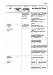 Landtag Mecklenburg-Vorpommern - 7. Wahlperiode Drucksache 7/992 Berufliche Wie viele Wie viele Wie viele Bewerbungen wurden Schule Bewerbungen Zulassungen aus welchem Grund abgelehnt? sind bei zur Ausbildung der Schule wurden von den eingegangen? Schulen erteilt? Schule, ein Aus- Erz0-10HBSFVO M-V wurde daher bildungsvertrag nicht erfüllt. Nach Auskunft der wird erst am Schule wurden bereits einige der 30.08.2017 Bewerberinnen und Bewerber geschlossen) aufgrund fehlender Zulassungsvoraussetzungen nach § 3 Absatz 2 Erz0-10HBFSVO von Trägern abgelehnt.) Berufliche 31 19, 1 Bewerbung 11 Schule am konnte noch nicht (Eine Bewerberin hat ihre Klinikum abschließend Bewerbung aus gesundheitlichen Südstadt und bearbeitet werden Gründen zurückgezogen. Bei einer der Hansestadt Bewerbung fehlte die nach § 3 Rostock Absatz 2 Erz0-10HBFSVO erforderliche Mittlere Reife. Bei 7 Bewerbungen war die Zulassungsvoraussetzung nach § 4 Absatz 2 Nummer 7 Erz0-10HBSFVO M-V nicht erfüllt, es konnte kein Ausbildungsvertrag mit einem Träger einer Kindertageseinrichtung nachgewiesen werden. 2 Bewerbungen wurden abgelehnt, da sie nicht aus dem Einzugsbereich der Beruflichen Schule am Klinikum Südstadt und der Hansestadt Rostock stammten. Die Bewerbungen wurden an das gemäß den Regelungen der Berufsschulorganisationsverordnung zuständige Regionale Berufliche Bildungszentrum des Landkreises Rostock weitergeleitet.) Regionales 21 13 8 Berufliches (Bei 4 Bewerbungen war die Bildungs- Zulassungsvoraussetzung nach zentrum des § 4 Absatz 2 Nummer 7 Landkreises Erz0-10HBSFVO M-V nicht erfüllt, Rostock es konnte kein Ausbildungsvertrag mit einem Träger einer Kindertageseinrichtung nachgewiesen werden. Bei zwei Bewerbungen wurde die Zulassungsvoraussetzungen nach 3