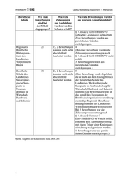 Drucksache 7/992 Landtag Mecklenburg-Vorpommern - 7. Wahlperiode Berufliche Wie viele Wie viele Wie viele Bewerbungen wurden Schule Bewerbungen Zulassungen aus welchem Grund abgelehnt? sind bei zur Ausbildung der Schule wurden von den eingegangen? Schulen erteilt? § 3 Absatz 2 Erz0-10HBFSVO (erbrachte Leistungen) nicht erfüllt. Zwei Bewerbungen wurden aus persönlichen Gründen zurückgezogen. Regionales 21 15, 2 Bewerbungen 4 Berufliches konnten noch nicht (Bei einer Bewerbung wurden die Bildungszen- abschließend Zulassungsvoraussetzungen nach trum des bearbeitet werden § 3 Absatz 2 Erz0-10HBFSVO nicht Landkreises erfüllt. Vorpommern- 3 Bewerbungen wurden aus Rügen persönlichen Gründen zurückgezogen.) Berufliche 30 23, 2 Bewerbungen 5 Schule des konnten noch nicht (Eine Bewerbung wurde abgelehnt, Landkreises abschließend da sie nicht aus dem Einzugsbereich Mecklenbur- bearbeitet werden der Beruflichen Schule des gische Seen- Landkreises Mecklenburgische platte in Seenplatte in Neubrandenburg für Neubran- Wirtschaft, Handwerk und Industrie denburg für stammte. Die Bewerbung wurde an Wirtschaft, das gemäß den Regelungen der Handwerk Berufsschulorganisationsverordnung und Industrie zuständige Regionale Berufliche Bildungszentrum des Landkreises Vorpommern-Rügen weitergeleitet. Bei 3 Bewerbungen war die Zulassungsvoraussetzung nach § 4 Absatz 2 Nummer 7 Erz0-10HBSFVO M-V nicht erfüllt, es konnte kein Ausbildungsvertrag mit einem Träger einer Kindertages- einrichtung nachgewiesen werden. 1 Bewerbung wurde aus persön- lichen Gründen zurückgezogen.) Quelle: Angaben der Schulen zum Stand 28.08.2017 4