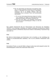 Landtag Mecklenburg-Vorpommern - 7. Wahlperiode Drucksache 7/992 7. Bis wann soll der Evaluierungsbericht der Diakonischen BildungsZentrum Mecklenburg-Vorpommern gGmbH vom Mai 2017 durch die Landesregierung ausgewertet und die Ergebnisse dem Landtag zur Verfügung gestellt werden (siehe Antworten der Landes- regierung auf die Kleine Anfrage auf Drucksache 7/721, hier: Antwort zu Frage 7 b)? Die Auswertung des Evaluationsberichts ist noch nicht abgeschlossen. Ein Termin, zu dem der Bericht abschließend geprüft werden soll, liegt nicht vor. Eine Übermittlung der Ergebnisse an den Landtag ist bisher nicht vorgesehen. 8. Bis wann und mit der Beteiligung welcher Expertinnen/Experten bzw. Fachstellen wird die Landesregierung eine „Empfehlung zur kompetenzorientierten Fort- und Weiterbildung von Fachkräften zu Mentorinnen und Mentoren in Kindertageseinrichtungen“ erarbeiten (siehe Antworten der Landesregierung auf die Kleine Anfrage auf Drucksache 7/721, hier: Antwort zu Frage 9)? Die Rahmenempfehlung zur „Kompetenzorientierten Fort- und Weiterbildung von Fachkräften zu Mentorinnen und Mentoren am Lernort Praxis in Mecklenburg-Vorpommern“ kann unter dem Link http://www.regierung-mv.de/Landesregierung/sm/Familie/Kindertagesf%C3% B6rderung/Fort-und-Weiterbildung/ abgerufen werden. Die Inhalte wurden in enger Abstimmung mit dem Zentrum für Praxis und Theorie der Jugend- hilfe - Schabernack e. V. erarbeitet. Der Verein unterstützt die Landesregierung bei der Wahr- nehmung der Aufgaben nach § 85 Absatz 2 Nummer 8 SGB VIII. 9. Wie erklärt sich die Landesregierung den rapiden Einbruch der Schülerzahlen in der Erstausbildung zur Erzieherin/zum Erzieher an öffentlichen oder privaten Schulen in Mecklenburg-Vorpommern für das Schuljahr 2016/2017 in den Jahrgangsstufen 3 und 4 (siehe Antworten der Landesregierung auf die Kleine Anfrage auf Drucksache 7/721, hier: Antwort zu Frage 3)? In den Zahlen der Jahrgangsstufe 1 und 2 sind alle Schülerinnen und Schüler der Erzieherausbildung (Vollzeitausbildung und berufsbegleitende Ausbildung in Teilzeit) enthalten. Die Fachschulausbildung in Vollzeit dauert zwei Jahre. Die berufsbegleitende Ausbildung von Erzieherinnen und Erziehern dauert vier Jahre. Im Rahmen der amtlichen Schulstatistik werden in den Jahrgangstufen 3 und 4 nur die Schülerinnen und Schüler der entsprechenden Jahrgangsstufen der vierjährigen berufsbegleitenden Erzieherausbildung erfasst. Demzufolge ist die Schülerzahl in den ersten beiden Jahrgängen wesentlich höher. Zum Schuljahr 2016/2017 hat nur die Berufliche Schule der Landeshauptstadt Schwerin für Gesundheit und Sozialwesen die Jahrgangsstufen 3 und 4 vorgehalten. 7