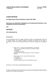LANDTAG MECKLENBURG-VORPOMMERN Drucksache 7/2755 7. Wahlperiode 22.11.2018 KLEINE ANFRAGE der Abgeordneten Simone Oldenburg, Fraktion DIE LINKE Abordnung von Lehrkräften in Ministerien und nachgeordnete Behörden in den Schuljahren 2017/2018 und 2018/2019 und ANTWORT der Landesregierung Vorbemerkung Die Landesregierung sieht die vorrangige Aufgabe der Schulen in der pädagogischen Arbeit und ist deshalb bestrebt, den Aufwand bezüglich Verwaltung und Statistik auf das Maß zu beschränken, welches für die Steuerung und Aufsicht der Schulverwaltungsprozesse unabdingbar ist. 1. Welche Zahl von Lehrkräften allgemeinbildender und beruflicher Schulen ist in den Schuljahren 2017/2018 und 2018/2019 (Stichtag 1. Oktober 2018) an a) Ministerien, b) nachgeordnete Behörden abgeordnet (bitte nach Schulamtsbereichen, Schulart und Behörde angeben)? 2. Welche Zahl der in Frage 1 erfragten Abordnungen beträgt a) bis 6 Monate, b) 6 Monate bis 1 Jahr, c) mehr als 1 Jahr (bitte nach Schulamtsbereichen, Schulart und Behörde angeben)? Die Fragen 1 und 2 werden zusammenhängend beantwortet. Die Ministerin für Bildung, Wissenschaft und Kultur hat namens der Landesregierung die Kleine Anfrage mit Schreiben vom 20. November 2018 beantwortet.