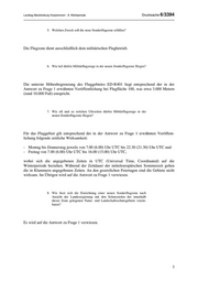 Landtag Mecklenburg-Vorpommern - 6. Wahlperiode Drucksache 6/3394 5. Welchen Zweck soll die neue Sonderflugzone erfüllen? Die Flugzone dient ausschließlich dem militärischen Flugbetrieb. 6. Wie tief dürfen Militärflugzeuge in der neuen Sonderflugzone fliegen? Die unterste Höhenbegrenzung des Fluggebietes ED-R401 liegt entsprechend der in der Antwort zu Frage 1 erwähnten Veröffentlichung bei Flugfläche 100, was etwa 3.000 Metern (rund 10.000 Fuß) entspricht. 7. Wie oft und zu welchen Uhrzeiten dürfen Militärflugzeuge in der neuen Sonderflugzone fliegen? Für das Fluggebiet gilt entsprechend der in der Antwort zu Frage 1 erwähnten Veröffent- lichung folgende zeitliche Wirksamkeit: - Montag bis Donnerstag jeweils von 7.00 (6.00) Uhr UTC bis 22.30 (21.30) Uhr UTC und - Freitag von 7.00 (6.00) Uhr UTC bis 16.00 (15.00) Uhr UTC, wobei sich die angegebenen Zeiten in UTC (Universal Time, Coordinated) auf die Winterperiode beziehen. Während der Zeitdauer der mitteleuropäischen Sommerzeit gelten die in Klammern angegebenen Zeiten. An den gesetzlichen Feiertagen sind die Gebiete nicht wirksam. Im Übrigen wird auf die Antwort zu Frage 1 verwiesen. 8. Wie lässt sich die Einrichtung einer neuen Sonderflugzone nach Ansicht der Landesregierung mit den Schutzzielen der innerhalb dieser Zone gelegenen Natur- und Landschaftsschutzgebiete verein- baren? Es wird auf die Antwort zu Frage 1 verwiesen. 3