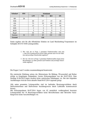 Drucksache 6/3110 Landtag Mecklenburg-Vorpommern - 6. Wahlperiode Schulart BM Schulamt GW NB RO SN BS 26 FöS 20 17 15 20 GS 73 35 42 63 GY 13 7 10 16 IGS 2 2 5 2 KGS 3 5 5 5 RegS 44 19 25 44 Summe 26 155 85 102 150 Gesamt 518 Somit ergeben sich für alle öffentlichen Schulen im Land Mecklenburg-Vorpommern im Schuljahr 2013/14 1036 Leitungsstellen. 2. Wie viele der in Frage 1 genannten Funktionsstellen sind zum 1. Juni 2014 kommissarisch besetzt (bitte getrennt nach Art der Funk- tion und jeweiliger Einzelschule angeben)? 3. Für wie viele der in Frage 2 genannten Funktionsstellen liegen keine Bewerbungen vor (bitte getrennt nach Funktion und jeweiliger Einzel- schule angeben)? Die Fragen 2 und 3 werden zusammenhängend beantwortet. Die statistische Erhebung seitens des Ministeriums für Bildung, Wissenschaft und Kultur erfolgt zu festgelegten Zeitpunkten. Letztes Erfassungsdatum war der 04.07.2014. Zum Stichtag 01.06.2014 liegen insofern keine statistischen Erhebungen vor. Bei den folgenden Ausführungen wird der letzte aktuelle Stand 04.07.2014 zugrunde gelegt. Alle unten genannten Leitungsstellen sind im laufenden Besetzungsverfahren durch Stellvertreterinnen und Stellvertreter beziehungsweise durch Lehrkräfte kommissarisch besetzt. Mit Erfassungsdatum 04.07.2014 liegen von 62 tatsächlich vorübergehend besetzten Leitungsstellen bei 16 Besetzungsverfahren keine Bewerberinnen oder Bewerber bezie- hungsweise keine Ausschreibungen vor. 2