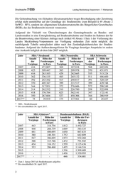 Drucksache 7/555 Landtag Mecklenburg-Vorpommern - 7. Wahlperiode Die Geltendmachung von (Schadens-)Ersatzansprüchen wegen Beschädigung oder Zerstörung erfolgt nicht unmittelbar auf der Grundlage des Straßenrechts (zum Beispiel § 49 Absatz 2 StrWG - MV), sondern des allgemeinen Schadensersatzrechts des Bürgerlichen Gesetzbuches (BGB), das das Straßenrecht insoweit voraussetzt. Aufgrund der Vielzahl von Überschreitungen des Gemeingebrauchs an Bundes- und Landesstraßen ist eine Untergliederung auf Straßenabschnitte und Straßen im Rahmen der für die Beantwortung einer Kleinen Anfrage nach Artikel 40 Absatz 1 Satz 1 der Verfassung des Landes Mecklenburg-Vorpommern zur Verfügung stehenden Zeit nicht möglich; die nachfolgende Tabelle untergliedert daher nach den Zuständigkeitsbereichen der Straßen- bauämter. Aufgrund der Aufbewahrungsfristen für Vorgänge derartiger Ansprüche ist zudem eine Auskunft lediglich ab dem Jahr 2007 möglich. Jahr SBA* Stralsund SBA Neustrelitz SBA Schwerin Anzahl Höhe der Anzahl Höhe der Anzahl Höhe der der Forderungen der Forderungen der Forderungen Vorgänge in Euro Vorgänge in Euro Vorgänge in Euro 2007 416 473.807 369 187.018 568 602.026 2008 425 309.447 385 209.978 570 451.071 2009 416 263.103 429 262.665 535 513.224 2010 362 336.135 485 265.132 511 486.600 2011 392 243.102 415 240.817 391 320.329 2012 370 405.347 399 221.517 399 429.748 2013 344 317.951 372 276.606 572 298.249 2014 314 262.532 310 226.780 558 522.098 2015 418 376.784 625 562.141 347 172.141 2016 350 267.604 527 450.306 344 288.919 2017** 75 39.919 175 137.961 60 25.037 * SBA - Straßenbauamt ** Bis einschließlich 30. April 2017. Jahr SBA Güstrow* Bundesautobahnen (BAB) Anzahl der Höhe der Anzahl der Höhe der For- Vorgänge Forderungen Vorgänge derungen in Euro in Euro 2007 463 318.756 1.812 1.492.727 2008 448 266.739 1.669 383.535 2009 481 400.695 1.650 867.833 2010 380 240.301 1.752 662.809 2011 547 386.695 1.973 932.260 2012 388 315.746 1.472 791.945 2013 454 316.152 1.559 1.125.436 2014 353 286.468 1.455 1.144.516 2015 - - 1.336 1.309.689 2016 - - 1.456 1.350.993 2017** - - 446 334.681 * Zum 1. Januar 2015 als Straßenbauamt aufgelöst. ** Bis einschließlich 30. April 2017. 2