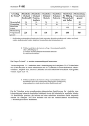 Drucksache 7/1563 Landtag Mecklenburg-Vorpommern - 7. Wahlperiode Grundtyp Staatliches Staatliches Staatliches Staatliches Ministerium Mecklenburg- der Schule* Schulamt Schulamt Schulamt Schulamt für Bildung, Vorpommern Greifswald Neubran- Rostock Schwerin Wissenschaft gesamt denburg und Kultur Gesamtschule 14 16 34 16 - 80 Gymnasium 29 26 13 30 - 98 Berufliche - - - - 105 105 Schule Mecklenburg- Vorpommern 226 86 138 230 105 785 gesamt * Die Schulen wurden nach dem Grundtyp der Schule zugeordnet: Beispielsweise Regionale Schulen mit Grund- schulen den Regionalen Schulen, Integrierte Gesamtschulen den Gesamtschulen etc. 2. Welche Anzahl der in der Antwort zu Frage 1 bezeichneten Lehrkräfte ohne Lehrbefähigung ist a) befristet auf einer unbefristet besetzbaren Stelle und b) unbefristet beschäftigt? Die Fragen 2 a) und 2 b) werden zusammenhängend beantwortet. Von den insgesamt 785 Lehrkräften ohne Lehrbefähigung des Schuljahres 2017/2018 befinden sich 374 Lehrkräfte in einem unbefristeten und 411 Lehrkräfte in einem befristeten Arbeits- verhältnis. Angaben dazu, ob diese Lehrkräfte auf einer unbefristet besetzbaren Stelle geführt werden, liegen nicht vor. 3. Welche Anzahl der in der Antwort zu Frage 2 a) bezeichneten befristet Beschäftigten hat an der grundlegenden pädagogischen Qualifizierung teilgenommen bzw. nimmt derzeit an dieser Qualifizierung teil? Für die Teilnahme an der grundlegenden pädagogischen Qualifizierung für Lehrkräfte ohne Lehrbefähigung haben die staatlichen Schulämter sowie die Schulaufsicht berufliche Schulen 191 Beschäftigte gemeldet, die befristet auf einer unbefristet besetzbaren Stelle eingestellt wurden. Im Schuljahr 2017/2018 befinden sich mit der vorbezeichneten Voraussetzung 73 Beschäftigte in dieser Maßnahme. 2