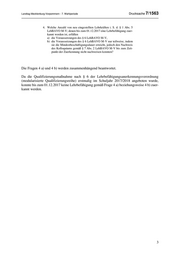 Landtag Mecklenburg-Vorpommern - 7. Wahlperiode Drucksache 7/1563 4. Welche Anzahl von neu eingestellten Lehrkräften i. S. d. § 1 Abs. 5 LehBAVO M-V; denen bis zum 01.12.2017 eine Lehrbefähigung zuer- kannt worden ist, erfüllen a) die Voraussetzungen des § 6 LehBAVO M-V, b) die Voraussetzungen des § 6 LehBAVO M-V nur teilweise, indem sie die Mindestbeschäftigungsdauer erreicht, jedoch den Nachweis des Kolloquiums gemäß § 7 Abs. 2 LehBAVO M-V bis zum Zeit- punkt der Zuerkennung nicht nachweisen konnten? Die Fragen 4 a) und 4 b) werden zusammenhängend beantwortet. Da die Qualifizierungsmaßnahme nach § 6 der Lehrbefähigungsanerkennungsverordnung (modularisierte Qualifizierungsreihe) erstmalig im Schuljahr 2017/2018 angeboten wurde, konnte bis zum 01.12.2017 keine Lehrbefähigung gemäß Frage 4 a) beziehungsweise 4 b) zuer- kannt werden. 3