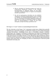 Drucksache 7/1275 Landtag Mecklenburg-Vorpommern - 7. Wahlperiode 6. Führt die Absenkung der Unterrichtsversorgung nach Ansicht der Landesregierung perspektivisch zwingend zu einer geringeren Personalausstattung an öffentlichen Schulen mit dem Förder- schwerpunkt „Geistige Entwicklung“ im Vergleich zu den Schuljahren 2014/2015 und 2015/2016? 7. Wie will die Landesregierung sicherstellen, dass trotz erheblicher Absenkung der Unterrichtsversorgung gemäß der „Ersten Verordnung zur Änderung der Kontingentstundentafelverordnung vom 6. Juni 2014“ die Unterrichtung und ganztägige pädagogische Förderung der Schülerinnen und Schüler zur Umsetzung der Inhalte des Rahmen- planes im Ganztagsschulbetrieb an Schulen mit dem Förder- schwerpunkt „Geistige Entwicklung“ gewährleistet wird? Die Fragen 4, 5, 6 und 7 werden im zusammenhängend beantwortet. Wie den Antworten zu den Fragen 1 bis 3 entnommen werden kann, erfolgte keine generelle Absenkung der Unterrichtsversorgung an öffentlichen Schulen mit dem Förderschwerpunkt „Geistige Entwicklung“. Unabhängig davon, dass in Einzelfällen aufgrund veränderter Schülerzahlen oder veränderter Verteilung der Schülerinnen und Schüler auf Jahrgangsstufen Budgetanpassungen unabhängig von der Schulart erfolgen können (siehe Antwort zu Frage 2), ist die Zuweisung der notwendigen Stunden an allen öffentlichen allgemeinbildenden Schulen zu 100 Prozent der Unterrichtsversorgung sichergestellt. Allen öffentlichen allgemeinbildenden Schulen stehen mehr Stellen zur Verfügung, als allein zur Absicherung des Unterrichts gemäß Stundentafel notwendig sind. 4
