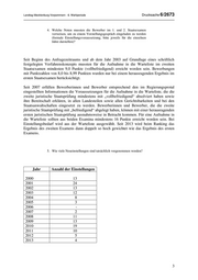 Landtag Mecklenburg-Vorpommern - 6. Wahlperiode Drucksache 6/2673 4. Welche Noten mussten die Bewerber im 1. und 2. Staatsexamen vorweisen, um zu einem Vorstellungsgespräch eingeladen zu werden (formale Einstellungsvoraussetzung, bitte jeweils für die einzelnen Jahre darstellen)? Seit Beginn des Anfragezeitraums und ab dem Jahr 2003 auf Grundlage eines schriftlich festgelegten Verfahrenskonzepts mussten für die Aufnahme in die Warteliste im zweiten Staatsexamen mindesten 9,0 Punkte (vollbefriedigend) erreicht worden sein. Bewerbungen mit Punktzahlen von 8,0 bis 8,99 Punkten wurden nur bei einem herausragenden Ergebnis im ersten Staatsexamen berücksichtigt. Seit 2007 erfüllen Bewerberinnen und Bewerber entsprechend den im Regierungsprotal eingestellten Informationen die Voraussetzungen für die Aufnahme in die Warteliste, die die zweite juristische Staatsprüfung mindestens mit „vollbefriedigend“ absolviert haben sowie ihre Bereitschaft erklären, in allen Landesteilen sowie allen Gerichtsbarkeiten und bei den Staatsanwaltschaften eingesetzt zu werden. Bewerberinnen und Bewerber, die die zweite juristische Staatsprüfung mit „befriedigend“ abgelegt haben, können mit einer herausragenden ersten juristischen Staatsprüfung ausnahmsweise in Betracht kommen. Für eine Aufnahme in die Warteliste sollten aus beiden Examina mindestens 16 Punkte erreicht worden sein. Bei Einstellungsbedarf wird aus der Warteliste ausgewählt. Seit 2013 wird beim Ranking das Ergebnis des zweiten Examens dann doppelt so hoch gewichtet wie das Ergebnis des ersten Examens. 5. Wie viele Neueinstellungen sind tatsächlich vorgenommen worden? Jahr Anzahl der Einstellungen 2000 13 2001 24 2002 13 2003 12 2004 8 2005 3 2006 - 2007 2 2008 11 2009 13 2010 19 2011 10 2012 5 2013 4 3