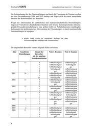 Drucksache 6/2673 Landtag Mecklenburg-Vorpommern - 6. Wahlperiode Die Schwankungen bei den Neueinstellungen sind durch die Umsetzung der Einsparvorgaben aus dem Personalkonzept 2004 und 2010 bedingt und liegen nicht an einem mangelnden Interesse der Bewerberinnen und Bewerber. Wegen der Altersstruktur des richterlichen und staatsanwaltschaftlichen Personalkörpers, wegen der Vielzahl der abzudeckenden Standorte und für eine dementsprechende ordnungs- gemäße Personalbewirtschaftung ist eine größere Zahl von Probebediensteten unabdingbar. Insbesondere der problematischen Altersstruktur des Personalkörpers ist durch kontinuierliche Neueinstellungen zu begegnen. 6. Welche Noten wiesen die eingestellten Bewerber auf (bitte Differenzierung nach Jahrgängen und Notenbereichen)? Die eingestellten Bewerber konnten folgende Noten vorweisen: Jahr Anzahl der Anzahl der Note 1. Examen Note 2. Examen Einstellungen Bewerber mit der gleichen Notenkonstellation 2000 13 4 vollbefriedigend vollbefriedigend 3 vollbefriedigend befriedigend 1 vollbefriedigend gut 3 befriedigend vollbefriedigend 2 gut vollbefriedigend 2001 24 7 vollbefriedigend vollbefriedigend 1 vollbefriedigend befriedigend 16 befriedigend vollbefriedigend 2002 13 5 vollbefriedigend vollbefriedigend 5 befriedigend vollbefriedigend 3 gut vollbefriedigend 2003 12 9 vollbefriedigend vollbefriedigend 1 befriedigend vollbefriedigend 2 gut vollbefriedigend 2004 8 6 vollbefriedigend vollbefriedigend 1 vollbefriedigend befriedigend 1 gut vollbefriedigend 2005 3 1 vollbefriedigend vollbefriedigend 1 gut vollbefriedigend 1 gut gut 2006 - 2007 2 2 vollbefriedigend vollbefriedigend 2008 11 5 vollbefriedigend vollbefriedigend 1 vollbefriedigend befriedigend 4 befriedigend vollbefriedigend 1 gut gut 4