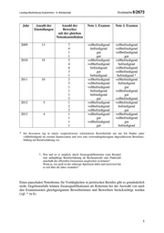 Drucksache 6/2673 Landtag Mecklenburg-Vorpommern - 6. Wahlperiode 8. Wie viele Bewerber sind nach einem Einstellungsgespräch in den einzelnen Jahrgängen als ungeeignet abgelehnt worden? Da zu Einstellungsgesprächen nur im Sinne der oben genannten Kriterien geeignete Bewerberinnen und Bewerber eingeladen wurden, wurden nach einem Vorstellungsgespräch auch keine Bewerber als ungeeignet abgelehnt. In diesem Verfahrensstadium konnte der Grund für eine Absage nur eine besser geeignete Mitbewerberin oder ein besser geeigneter Mitbewerber sein. 9. Wie viele Bewerber haben nach einer Zusage aus der Justiz ihre Bewerbung wieder zurückgezogen (bitte ebenfalls nach den einzelnen Jahrgängen aufschlüsseln)? 2010: 3 2011: 2 2012: 2 2013: 1 Für die Zeit vor 2010 können dazu keine gesicherten Angaben gemacht werden, da hierüber keine Statistiken beziehungsweise Übersichten geführt werden (§ 84 Absatz 1 LBG M-V). 6