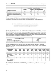 Drucksache 7/1978 Landtag Mecklenburg-Vorpommern - 7. Wahlperiode Anzahl der Auszubildenden Gesamt davon in der Jahrgangsstufe Ausbildungsrichtung 1 2 3 Altenpflege 783 300 244 239 Gesundheits- und Krankenpflege 1.586 555 450 581 Gesundheits- und Kinderkranken- 84 20 33 31 pflege Für das Schuljahr 2017/2018 liegt noch keine amtliche Schulstatistik vor. Hinsichtlich der Anzahl der Umschüler liegen der Landesregierung keine Angaben vor. 2. Wie hat sich die Zahl der Auszubildenden und der erfolgreichen Absol- venten in den drei Ausbildungsrichtungen in den letzten zehn Jahren in Mecklenburg-Vorpommern entwickelt (bitte pro Jahr ausweisen)? Für die Angaben hinsichtlich der Zahl der Auszubildenden bis einschließlich Schuljahr 2014/2015 wird auf die Antwort der Landesregierung auf die Kleine Anfrage auf Drucksache 6/5163 (Frage 6) verwiesen. Für das Schuljahr 2015/2016 liegen folgende Daten gemäß amt- licher Schulstatistik der beruflichen Schulen hinsichtlich der Anzahl der Auszubildenden in den in der Fragestellung aufgeführten Ausbildungsrichtungen vor: Ausbildungsrichtung Gesamt Altenpflege 838 Gesundheits- und Krankenpflege 1.611 Gesundheits- und Kinderkrankenpflege 66 Für die Schuljahre 2016/2017 und 2017/2018 wird auf die Antwort zur Frage 1 verwiesen. Hinsichtlich der Zahl der erfolgreichen Absolventen liegen folgende Daten gemäß amtlicher Schulstatistik vor: Ausbildungs- 2007/ 2008/ 2009/ 2010/ 2011/ 2012/ 2013/ 2014/ 2015/ richtung 2008 2009 2010 2011 2012 2013 2014 2015 2016 Altenpflege 176 196 202 186 221 187 232 212 238 Gesundheits- 362 453 361 345 417 333 351 397 369 und Kranken- pflege Gesundheits- 43 45 48 41 21 41 20 29 24 und Kinder- krankenpflege Für die Schuljahre 2016/2017 und 2017/2018 liegen noch keine entsprechenden Auswertungen vor. 2