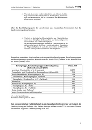 Landtag Mecklenburg-Vorpommern - 7. Wahlperiode Drucksache 7/1978 3. Wie viele Absolventen wurden in den letzten zehn Jahren in Mecklen- burg-Vorpommern beschäftigt (bitte für die Altenpflege, die Gesund- heits- und Krankenpflege und die Gesundheits- und Kinderkranken- pflege getrennt ausweisen)? Über die Beschäftigungsquote der Absolventen aus Mecklenburg-Vorpommern hat die Landesregierung keine Kenntnis. 4. Wie hoch ist der Bedarf an Pflegefachkräften und Pflegehilfskräften zurzeit in der Altenpflege, der Gesundheits- und Krankenpflege sowie der Gesundheits- und Kinderkrankenpflege? Mit welcher Bedarfsentwicklung rechnet die Landesregierung für die nächsten zehn Jahre in der Pflege, sowohl aufgrund der Entwicklung der Pflegebedürftigkeit, als auch der Altersstruktur der Pflegekräfte sowie des vorfristigen Ausscheidens aus dem Pflegeberuf? Bestand an gemeldeten Arbeitsstellen nach ausgewählten Berufsgruppen, Berufsuntergruppen und Berufsgattungen gemäß der Klassifikation der Berufe 2010 (Zielberuf in der Klassifikation der Berufe (KldB) 2010): Berufsgruppe, Berufsuntergruppe und Berufsgattung März 2018 (Zielberuf der KldB 2010) gemeldete Arbeitsstellen in M-V insgesamt 16.273 Gesundheits- und Krankenpflege, Rettungsdienst, Geburtshilfe 218 Berufe Gesundheits-, Krankenpflege (o. S.) 198 - Gesundheits-, Krankenpflege (o. S.)-Helfer 34 - Gesundheits-,Krankenpflege (o. S.)-Fachkraft 164 Altenpflege 441 Berufe in der Altenpflege (o. S.) 440 - Altenpflege (o. S.) - Helfer 168 - Altenpflege (o. S.) - Fachkraft 272 Keine Angabe zum Zielberuf 3 wegen Anonymisierung nicht zugeordnet 18 o. S. = ohne Spezialisierung Statistik der Bundesagentur für Arbeit Zum voraussichtlichen Fachkräftebedarf in den Gesundheitsberufen wird auf die Antwort der Landesregierung auf die Frage 8 der Kleinen Anfrage auf Drucksache 7/716 verwiesen. Weitere Erkenntnisse liegen der Landesregierung nicht vor. 3
