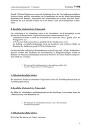 Drucksache 7/1978 Landtag Mecklenburg-Vorpommern - 7. Wahlperiode 5. Wie schätzt die Landesregierung die Entwicklung der Zahl potenziell Auszubildender für die Pflege in den nächsten zehn Jahren ein, sowohl anhand der Geburten und der Zahl der Schulabgänger, als auch hin- sichtlich der derzeit nicht sozialversicherungspflichtig beschäftigten Bevölkerung? Eine Prognose zu der Entwicklung der Anzahl der potentiell Auszubildenden in den betref- fenden Pflegeausbildungen für die kommenden zehn Jahre vermag die Landesregierung nicht zu stellen. 6. Welche Aufwendungen sind Bestandteil der derzeitigen Finanzierung der Ausbildung in der Altenpflege, der Gesundheits- und Kranken- pflege sowie der Gesundheits- und Kinderkrankenpflege? Wie gliedern sich diese zwischen theoretischer und praktischer Ausbil- dung auf? Bei den Aufwendungen ist zu unterscheiden zwischen den öffentlichen und den beruflichen Schulen in freier Trägerschaft: A. Öffentliche berufliche Schulen Gemäß § 109 des Schulgesetzes trägt das Land die Personalkosten der Lehrerinnen und Lehrer und des Personals nach § 100 Absatz 8 an den Schulen in öffentlicher Trägerschaft. Personal- kosten im Sinne dieses Gesetzes sind die Aufwendungen für 1. Dienstbezüge der Beamtinnen und Beamten und Vergütungen der Angestellten, 2. Beiträge zur Sozialversicherung und zur zusätzlichen Altersversorgung, 3. Sonderzuwendungen, Jubiläumszuwendungen, Mehrarbeitsentschädigungen und Über- stundenvergütungen, Aufwandsentschädigungen, 4. Vergütungen für nebenberufliche, nebenamtliche oder sonst teilbeschäftigte Lehrerinnen und Lehrer, 5. Ruhegehälter und Hinterbliebenenversorgung, 6. Unterhaltsbeiträge, Übergangsgelder, Abfindungs- und Nachversicherungsbeiträge, 7. Beihilfen, Unterstützungen und Unfallfürsorgeleistungen, 8. Reisekostenvergütungen, Trennungsgelder, Beiträge für Wohnraumbeschaffung und Umzugskosten, 9. Kosten der Fortbildung, der gesundheitlichen Überwachung und der Stellenausschrei- bungen und 10. die Aufwandsvergütungen an Lehrerinnen und Lehrer sowie an Hilfskräfte zur Durchfüh- rung von Schulwanderungen und Lehrausflügen sowie zum Aufenthalt in Schulland- heimen. Gemäß § 110 des Schulgesetzes werden die Sachkosten der Schulen in öffentlicher Träger- schaft von den Schulträgern aufgebracht. 4