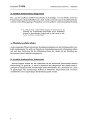 Drucksache 7/1978 Landtag Mecklenburg-Vorpommern - 7. Wahlperiode B. Berufliche Schulen in freier Trägerschaft Das Land, die Landkreise und kreisfreien Städte, die Schulträger sowie die Schüler sind an der Finanzierung der erforderlichen Personal-, Sach- und Investitionskosten der beruflichen Ersatz- schulen mit den Bildungsgängen Altenpflege sowie Gesundheits- und Krankenpflege beteiligt. 9. In welchem Maße werden tarifliche Entgelte für das Personal in den staatlichen und nichtstaatlichen Pflegeschulen, für das Ausbildungs- personal bei den praktischen Einsätzen und bei den Trägern der prak- tischen Ausbildung berücksichtigt? A. Öffentliche berufliche Schulen An den staatlichen Pflegeschulen ist die Besoldung beziehungsweise die Entlohnung aller Lehr- kräfte tarifgebunden. Das heißt, die Entgelte der Arbeitnehmerinnen und Arbeitnehmer richten sich nach dem Tarifvertrag für den öffentlichen Dienst der Länder und die Besoldung der Beamten nach dem Landesbesoldungsgesetz. B. Berufliche Schulen in freier Trägerschaft Tarifliche Entgelte werden bei den Lehrkräften an den beruflichen Ersatzschulen insoweit berücksichtigt, als gemäß § 120 Absatz 3 Nummer 4 des Schulgesetzes die Gehälter und Ver- gütungen bei entsprechenden Anforderungen hinter den Gehältern der Lehrerinnen und Lehrer an gleichartigen oder gleichwertigen Schulen in öffentlicher Trägerschaft nicht wesentlich zurückbleiben und in regelmäßigen Zeitabständen gezahlt werden. 6