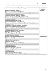Landtag Mecklenburg-Vorpommern - 6. Wahlperiode Drucksache 6/5402 Name der Schule Staatliches Schulamt Pestalozzi-Grundschule Torgelow Greifswald Regionale Schule mit Grundschule Wolgast Regionale Schule mit Grundschule „Ernst Moritz Arndt Greifswald“ Förderschule „Jan-Amos Komensky“ Barth Grundschule „Hermann Burmeister“ Stralsund Integrierte Gesamtschule „Erwin Fischer“ Greifswald Förderschule am Stettiner Haff Zirchow Grundschule Altenpleen Förderschule Kleeblattschule Anklam Grundschule „Ferdinand v. Schill“ Stralsund Regionale Schule mit Grundschule „Johann-Christoph-Adelung“ Spantekow Grundschule Marlow Grundschule „An der alten Feuerwehr“ Heringsdorf Förderschule „Sonnenblumenschule“ Franzburg Förderschule „Ernst von Haselberg“ Stralsund Grundschule „Greif“ Greifswald Förderschule Schule „Am Park“ Behrenhoff Kooperative Gesamtschule Ahlbeck Oskar-Picht-Gymnasium Pasewalk Grundschule „Villa Kunterbunt“ Anklam Kranich-Grundschule Altenpleen Regionale Schule mit Grundschule Feldberg Neubrandenburg Grundschule Friedland Regionale Schule Möllenhagen Regionale Schule Burg Stargard Grundschule Dargun Regionale Schule mit Grundschule Feldberg Integrierte Gesamtschule Neubrandenburg Grundschule Schönfeld Förderschule Neustrelitz Grundschule Neustrelitz Kiefernheide Grundschule Burg Stargard Grundschule Röbel Förderschule Sietow Grundschule „Waren Kollwitz“ Waren Schule mit dem Förderschwerpunkt Lernen Waren 3