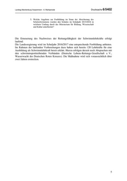 Landtag Mecklenburg-Vorpommern - 6. Wahlperiode Drucksache 6/5402 5. Welche Angebote zur Fortbildung im Sinne der Absicherung des Schulschwimmens wurden den Schulen im Schuljahr 2015/2016 in welchem Umfang durch das Ministerium für Bildung, Wissenschaft und Kultur unterbreitet? Die Erneuerung des Nachweises der Rettungsfähigkeit der Schwimmlehrkräfte erfolgt laufend. Die Landesregierung wird im Schuljahr 2016/2017 eine entsprechende Fortbildung anbieten. Im Rahmen der laufenden Vorbereitungen dazu haben sich bereits 120 Lehrkräfte für eine Ausbildung als Schwimmlehrkraft bereit erklärt. Hierzu erfolgen derzeit noch Absprachen mit den schwimmsporttreibenden Verbänden (Deutsche Lebens-Rettungs-Gesellschaft e. V., Wasserwacht des Deutschen Roten Kreuzes). Die Maßnahme wird sich voraussichtlich über zwei Jahren erstrecken. 5