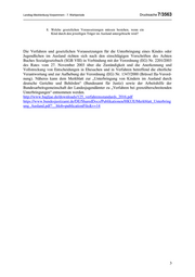 Landtag Mecklenburg-Vorpommern - 7. Wahlperiode Drucksache 7/3563 8. Welche gesetzlichen Voraussetzungen müssen bestehen, wenn ein Kind durch den jeweiligen Träger im Ausland untergebracht wird? Die Verfahren und gesetzlichen Vorausetzungen für die Unterbringung eines Kindes oder Jugendlichen im Ausland richten sich nach den einschlägigen Vorschriften des Achten Buches Sozialgesetzbuch (SGB VIII) in Verbindung mit der Verordnung (EG) Nr. 2201/2003 des Rates vom 27. November 2003 über die Zuständigkeit und die Anerkennung und Vollstreckung von Entscheidungen in Ehesachen und in Verfahren betreffend die elterliche Verantwortung und zur Aufhebung der Verordnung (EG) Nr. 1347/2000 (Brüssel IIa-Verord- nung). Näheres kann dem Merkblatt zur „Unterbringung von Kindern im Ausland durch deutsche Gerichte und Behörden“ (Bundesamt für Justiz) sowie der Arbeitshilfe der Bundesarbeitsgemeinschaft der Landesjugendämter zu „Verfahren bei grenzüberschreitenden Unterbringungen“ entnommen werden. http://www.bagljae.de/downloads/125_verfahrensstandards_2016.pdf https://www.bundesjustizamt.de/DE/SharedDocs/Publikationen/HKUE/Merkblatt_Unterbring ung_Ausland.pdf?__blob=publicationFile&v=14 3