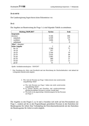 Drucksache 7/1198 Landtag Mecklenburg-Vorpommern - 7. Wahlperiode Zu a) und b) Der Landesregierung liegen hierzu keine Erkenntnisse vor. Zu c) Die Angaben zur Beantwortung der Frage 1 c) sind folgender Tabelle zu entnehmen. Stichtag 30.09.2017 Syrien Irak insgesamt, darunter: 9.166 204 männlich 6.549 125 weiblich 2.606 79 unbekannt 11 0 Alter¹ - darunter: keine Angabe 1 0 bis 16 2.240 71 16-18 357 5 18-25 2.344 19 25-35 2.435 48 35-45 1.092 24 45-55 489 21 55-65 157 11 ab 65 51 5 Quelle: Ausländerzentralregister - 30.09.2017 ¹ Eine Zuordnung des Alters zum Geschlecht und eine Berechnung des Durchschnittsalters sind anhand der vorliegenden Statistik nicht möglich. 2. Wie viele der Personen aus Frage 1 haben derzeit eine sozialversiche- rungspflichtige Stelle? a) Wie viele Personen aus Frage 1 haben eine nicht sozialversiche- rungspflichtige Stelle? b) In welchen Berufen und Gewerben sind sozialversicherungs- pflichtig beschäftigte Personen in welcher Anzahl tätig? c) Wie hoch ist die gegenwärtige Arbeitslosenquote bei den Personen aus Frage 1? Die Angaben zu den Fragen 2, a), b) und c) beziehen sich nicht auf den Personenkreis aus Frage 1., sondern auf die zu den Fragestellungen gemeldeten Personen in den Statistiken der Bundesagentur für Arbeit. Eine Verknüpfung der Einwohnermeldestatistik mit den Statistiken der Bundesagentur für Arbeit ist nicht möglich. 2