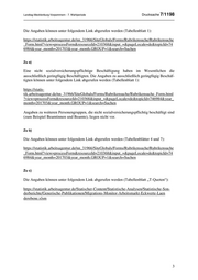 Landtag Mecklenburg-Vorpommern - 7. Wahlperiode Drucksache 7/1198 Die Angaben können unter folgendem Link abgerufen werden (Tabellenblatt 1): https://statistik.arbeitsagentur.de/nn_31966/SiteGlobals/Forms/Rubrikensuche/Rubrikensuche _Form.html?view=processForm&resourceId=210368&input_=&pageLocale=de&topicId=74 6984&year_month=201703&year_month.GROUP=1&search=Suchen Zu a) Eine nicht sozialversicherungspflichtige Beschäftigung haben im Wesentlichen die ausschließlich geringfügig Beschäftigten. Die Angaben zu ausschließlich geringfügig Beschäf- tigten können unter folgendem Link abgerufen werden (Tabellenblatt 1): https://statis- tik.arbeitsagentur.de/nn_31966/SiteGlobals/Forms/Rubrikensuche/Rubrikensuche_Form.html ?view=processForm&resourceId=210368&input_=&pageLocale=de&topicId=746984&year_ month=201703&year_month.GROUP=1&search=Suchen Angaben zu weiteren Personengruppen, die nicht sozialversicherungspflichtig beschäftigt sind (zum Beispiel Beamtinnen und Beamte), liegen nicht vor. Zu b) Die Angaben können unter folgendem Link abgerufen werden (Tabellenblätter 4 und 7): https://statistik.arbeitsagentur.de/nn_31966/SiteGlobals/Forms/Rubrikensuche/Rubrikensuche _Form.html?view=processForm&resourceId=210368&input_=&pageLocale=de&topicId=74 6984&year_month=201703&year_month.GROUP=1&search=Suchen Zu c) Die Angaben können unter folgendem Link abgerufen werden (Tabellenblatt „T-Quoten“): https://statistik.arbeitsagentur.de/Statischer-Content/Statistische-Analysen/Statistische-Son- derberichte/Generische-Publikationen/Migrations-Monitor-Arbeitsmarkt-Eckwerte-Laen derebene.xlsm 3