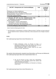 Drucksache 7/1198 Landtag Mecklenburg-Vorpommern - 7. Wahlperiode 3. Wie viele der Personen aus Frage 1 sind unterbeschäftigt im engeren Sinne? a) Wie viele dieser Personen nehmen in welcher Anzahl an einer Maß- nahme teil (bitte aufgliedern nach Personal Service Agenturen, Berufliche Weiterbildung, Fremdförderung, Arbeitsgelegenheiten, Arbeitsbeschaffungsmaßnahmen, trad. Strukturanpassungs- maßnahmen, Beschäftigung schaffende Infrastrukturmaßnahmen, Förderung von Arbeitsverhältnissen, Beschäftigungszuschuss, Beschäftigungsphase Bürgerarbeit und Bundesprogramm „Soziale Teilhabe am Arbeitsmarkt“)? b) Wie viele dieser Personen befinden sich in einem arbeitsmarkt- bedingten Sonderstatus (bitte aufgliedern nach Sonderregelungen für Ältere und kurzfristige Arbeitsunfähigkeit)? c) Wie viele der Personen aus Frage 1 haben seit 2013 eine Qualifi- kation wie zum Beispiel einen Führerschein, ein Sprachniveau oder einen Computerkurs bisher in Mecklenburg-Vorpommern absol- viert (bitte auflisten nach Qualifikation, Anzahl der Personen, Staatsbürgergruppe)? 4. Wie viele der Personen aus Frage 1 sind unterbeschäftigt nach BA- Konzept? a) Wie viele dieser Personen erhalten einen Gründungszuschuss, Exis- tenzgründungszuschüsse oder ein Einstiegsgeld zur Selbststän- digkeit? b) Wie viele dieser Personen weisen einen arbeitsmarktbedingten Sonderstatus (Altersteilzeit oder Kurzarbeiter) auf? Die Fragen 3, a), b), 4, a), und b) werden zusammenhängend beantwortet. Die Angaben zu den Fragen beziehen sich nicht auf den Personenkreis aus Frage 1. (siehe Antwort zu Frage 2.). Juli 2017 - Komponenten der Unterbeschäftigung Irak Arabische Republik Syrien Arbeitslose 77 1.999 + Personen, die im weiteren Sinne arbeitslos sind 15 505 davon: Maßnahmen zur Aktivierung 9 491 und beruflichen Eingliederung Sonderregelungen für Ältere (§ 53a Abs. 2 SGB II) 6 14 = Arbeitslosigkeit im weiteren Sinne 92 2.504 + Personen, die nah am Arbeitslosenstatus sind 30 * dar.: Personal Service Agenturen - - Förderung der beruflichen Weiterbildung - 35 inklusive Förderung behinderter Menschen Arbeitsgelegenheiten * 58 Fremdförderung 26 2.716 Beschäftigungsphase Bürgerarbeit - - Arbeitsbeschaffungsmaßnahmen - - Strukturanpassungsmaßnahmen - - Beschäftigung schaffende Infrastrukturmaßnahmen - - 4