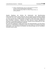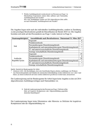 Drucksache 7/1198 Landtag Mecklenburg-Vorpommern - 7. Wahlperiode 7. Welche Ausbildungsberufe werden derzeit von Personen aus Frage 1 in Mecklenburg-Vorpommern erlernt (bitte auflisten nach Nationalität, Ausbildungsberuf und Anzahl)? Wie viele Ausbildungen wurden seit 2014 abgeschlossen (bitte auflis- ten nach Nationalität, Ausbildungsberuf und Anzahl)? Die Angaben liegen nicht nach den individuellen Ausbildungsberufen, sondern in Zuordnung zu den jeweiligen Berufssektoren gemäß der Klassifikation der Berufe 2010 vor. Die Angaben beziehen sich nicht auf den Personenkreis aus Frage 1 (siehe Antwort zu Frage 2). Staatsangehörigkeit Auszubildende nach Berufssektoren - Datenstand 31. März 2017 Insgesamt 6 Produktionsberufe * Personenbezogene Dienstleistungsberufe * Irak Kaufmännische und unternehmensbezogene Dienstleistungsberufe * IT- und naturwissenschaftliche Dienstleistungsberufe - Sonstige wirtschaftliche Dienstleistungsberufe - Insgesamt 35 Produktionsberufe 8 Arabische Personenbezogene Dienstleistungsberufe 20 Republik Syrien Kaufmännische und unternehmensbezogene Dienstleistungsberufe * IT- und naturwissenschaftliche Dienstleistungsberufe * Sonstige wirtschaftliche Dienstleistungsberufe - Quelle: Statistik der Bundesagentur für Arbeit 1) Arbeitsort (AO): Alle Beschäftigten, die in der betreffenden Region arbeiten, unabhängig vom Wohnort. *) Aus Datenschutzgründen und Gründen der statistischen Geheimhaltung werden Zahlenwerte von 1 oder 2 und Daten, aus denen rechnerisch auf einen solchen Zahlenwert geschlossen werden kann, anonymisiert. Der Landesregierung und der Bundesagentur für Arbeit liegen keine Angaben zu den seit 2014 abgeschlossenen Ausbildungsverträgen nach Nationalitäten vor. 8. Sieht die Landesregierung bei den Personen aus Frage 1 Defizite in Hin- blick auf kognitive Kompetenzen oder Allgemeinbildung gegenüber deutschen Staatsbürgern? Der Landesregierung liegen keine Erkenntnisse oder Hinweise zu Defiziten bei kognitiven Kompetenzen oder der Allgemeinbildung vor. 6