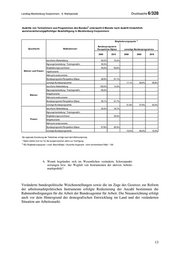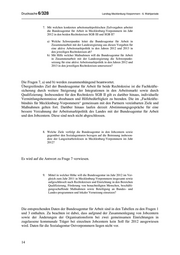 Landtag Mecklenburg-Vorpommern - 6. Wahlperiode Drucksache 6/328 1) Austritte von Teilnehmern aus Programmen des Bundes untersucht 6 Monate nach Austritt hinsichtlich sozialversicherungspflichtiger Beschäftigung in Mecklenburg-Vorpommern 2) Eingliederungsquote Bundesprogram m Geschlecht Maßnahm eart Perspektive 50plus sonstige Bundesprogram m e 2009 2010 2008 2009 2010 berufliche Weiterbildung 50,0% 15,4% - - - Eignungsfeststellung / Trainingsmaßn. 33,3% - - - - Eingliederungszuschüsse 40,0% 55,6% - - - Männer und Frauen ntgeltvariante - - - - - Mehraufw andsvariante - - - - - Bundesprogramm Perspektive 50plus 28,9% 31,1% - - - sonstige Bundesprogramme - - 17,1% 28,0% 36,8% berufliche Weiterbildung 100,0% 14,3% - - - Eignungsfeststellung / Trainingsmaßn. 50,0% - - - - Entgeltvariante - - - - - Männer Mehraufw andsvariante - - - - - Bundesprogramm Perspektive 50plus 30,1% 31,7% - - - sonstige Bundesprogramme - - 21,9% 27,6% 54,5% berufliche Weiterbildung 33,3% 16,7% - - - Eignungsfeststellung / Trainingsmaßn. - - - - - Eingliederungszuschüsse - 33,3% - - - Frauen Entgeltvariante - - - - - Mehraufw andsvariante - - - - - Bundesprogramm Perspektive 50plus 27,6% 30,3% - - - sonstige Bundesprogramme - - 12,5% 28,3% 12,5% Die regionale Zuordnung der Teilnehmer erfolgt nach dem Wohnortprinzip. 1) Daten stehen erst nur für die ausgew iesenen Jahre zur Verfügung. 2) EQ: Eingliederungsquote = svpfl. Beschäftigte / (Austritte insgesamt - nicht recherierbare Fälle) * 100 6. Womit begründen sich im Wesentlichen veränderte Schwerpunkt- setzungen bzw. der Wegfall von Instrumenten der aktiven Arbeits- marktpolitik? Veränderte bundespolitische Weichenstellungen sowie die im Zuge des Gesetzes zur Reform der arbeitsmarktpolitischen Instrumente erfolgte Reduzierung der Anzahl bestimmen die Rahmenbedingungen für die Arbeit der Bundesagentur für Arbeit. Die Neuausrichtung erfolgt auch vor dem Hintergrund der demografischen Entwicklung im Land und der veränderten Situation am Arbeitsmarkt. 13
