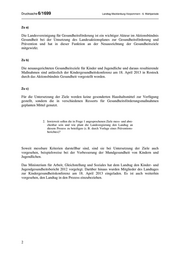 Drucksache 6/1699 Landtag Mecklenburg-Vorpommern - 6. Wahlperiode Zu a) Die Landesvereinigung für Gesundheitsförderung ist ein wichtiger Akteur im Aktionsbündnis Gesundheit bei der Umsetzung des Landesaktionsplanes zur Gesundheitsförderung und Prävention und hat in dieser Funktion an der Neuausrichtung der Gesundheitsziele mitgewirkt. Zu b) Die neuausgerichteten Gesundheitsziele für Kinder und Jugendliche und daraus resultierende Maßnahmen sind anlässlich der Kindergesundheitskonferenz am 18. April 2013 in Rostock durch das Aktionsbündnis Gesundheit vorgestellt worden. Zu c) Für die Untersetzung der Ziele werden keine gesonderten Haushaltsmittel zur Verfügung gestellt, sondern die in verschiedenen Ressorts für Gesundheitsförderungsmaßnahmen geplanten Mittel genutzt. 2. Inwieweit sollen die in Frage 1 angesprochenen Ziele mess- und abre- chenbar sein und wie plant die Landesregierung den Landtag an diesem Prozess zu beteiligen (z. B. durch Vorlage eines Präventions- berichtes)? Soweit messbare Kriterien darstellbar sind, sind sie bei Untersetzung der Ziele auch vorgesehen, beispielsweise bei der Verbesserung der Mundgesundheit von Kindern und Jugendlichen. Das Ministerium für Arbeit, Gleichstellung und Soziales hat dem Landtag den Kinder- und Jugendgesundheitsbericht 2012 vorgelegt. Darüber hinaus wurden Mitglieder des Landtages zur Kindergesundheitskonferenz am 18. April 2013 eingeladen. Es ist auch weiterhin vorgesehen, den Landtag in den Prozess einzubeziehen. 2