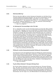 Wissenschaftliche Dienste Infobrief Seite 68 WD 1 - 3010 – 270/10 Aktion trägt dazu bei, dass Muslime ein Zeichen der Solidarität zu ihrer deutschen Gesellschaft setzen und auch gemeinsam bundesweit für Offenheit und Friedfertig- keit werben.“ http://www.zentralrat.de 03.10. Welttag des Wohn- und Siedlungswesens/Habitat-Tag* 1985 von den Vereinten Nationen proklamiert und auf den 1. Montag im Oktober festgesetzt, um auf die Entwicklung der Lebens- und Wohnbedingungen der Men- schen weltweit aufmerksam zu machen. http://www.unchs.org 04.10. Beginn der Internationalen Weltraumwoche 1999 von den Vereinten Nationen proklamiert. Die Woche, die in der Regel vom 4. bis 10. Oktober jedes Jahres stattfindet, soll den Beitrag der Weltraumforschung und -technologie zur Verbesserung der Situation der Menschheit würdigen. http://www.unoosa.org http://www.worldspaceweek.org 04.10. Welttierschutztag Der Welttierschutztag wurde im Mai 1931 auf dem Internationalen Tierschutzkon- gress in Florenz proklamiert. Als Datum wurde der 4. Oktober gewählt, der Tag, an dem im Jahr 1228 Franz von Assisi (1181/82-1226) heilig gesprochen worden war. http://www.tierschutzbund.de 05.10. Internationaler Tag des Lehrers 1994 von der UNESCO proklamiert. Der Internationale Tag des Lehrers soll das En- gagement von Lehrerinnen und Lehrern würdigen und die Bedeutung von Bildung in den Blickpunkt der Öffentlichkeit rücken. http://www.unesco.org 09.10. Weltposttag/Tag des Weltpostvereins Der „Weltposttag“ wurde 1969 vom „Weltpostverein“ (UPU) proklamiert. Der Tag soll an die Gründung des Weltpostvereins am 9. Oktober 1874 erinnern. http://www.upu.int 10.10. Weltweiter und Europäischer Tag gegen die Todesstrafe Der „Internationale Tag gegen die Todesstrafe“ wurde im Jahr 2003 von einer Koa- lition aus nichtstaatlichen Organisationen und Vereinigungen, der „World Coalition against Death Penalty“ (WCADP), proklamiert und wird seither am 10. Oktober begangen. Der Europarat und die Europäische Union haben 2007 den 10. Oktober offiziell zum „Europäischen Tag gegen die Todesstrafe“ erklärt. Europa ist