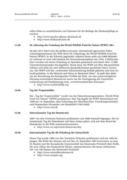 Wissenschaftliche Dienste Infobrief Seite 62 WD 1 - 3010 – 270/10 rellen Erbes zu sensibilisieren und Interesse für die Belange der Denkmalpflege zu wecken. http://www.tag-des-offenen-denkmals.de http://www.denkmalschutz.de 11.09. 50. Jahrestag der Gründung des World Wildlife Fund for Nature (WWF) 1961 Im Jahr 2011 feiert eine der größten privaten, international agierenden Natur- schutzorganisationen der Welt ihren 50. Geburtstag: der World Wildlife Fund for Nature (WWF). In der Schweiz gegründet, arbeiten heute mehr als 4.000 Mitarbei- ter weltweit in rund 100 Ländern bei Naturschutzprojekten mit. Über 3 Milliarden Euro wurden seit seiner Gründung an Spenden gesammelt und damit über 11.000 Umweltschutzprojekte durchgeführt. Heute kann der WWF auf über 300 geschützte Gebiete und mehr als zwei Millionen Quadratkilometer geschützte Natur verwei- sen. Der WWF will der „weltweiten Naturzerstörung Einhalt gebieten und eine Zu- kunft gestalten, in der Mensch und Natur in Harmonie leben“. Es geht ihm dabei um die Bewahrung der biologischen Vielfalt der Erde, um eine naturverträgliche Nutzung erneuerbarer Ressourcen sowie um die Verringerung der Umweltver- schmutzung und Eindämmung eines „verschwenderischen Konsums“. http://www.worldwildlife.org 14.09. Tag der Tropenwälder Der „Tag der Tropenwälder“ wurde von der Naturschutzorganisation „World Wide Fund For Nature“ (WWF) proklamiert. Den Tag begeht der WWF Deutschland seit 1989 am 14. September, dem Geburtstag des Naturforschers, Forschungsreisenden und Humanisten Alexander von Humboldt (1769-1859). http://www.wwf.de 15.09. Internationaler Tag der Demokratie 2007 von den Vereinten Nationen proklamiert und 2008 erstmals begangen. Der In- ternationale Tag der Demokratie soll dazu Anlass geben, sich mit dem Stand der Demokratie in der Welt auseinanderzusetzen. http://www.un.org/events/democracyday 16.09. Internationaler Tag für die Erhaltung der Ozonschicht Dieser Tag wurde 1994 von den Vereinten Nationen proklamiert und seit 1995 be- gangen. Die Wahl des Datums soll auf den 16. September 1987 hinweisen, an dem 24 Staaten und die Europäische Gemeinschaft das Montrealer Protokoll über Stoffe, die zum Abbau der Ozonschicht führen, unterzeichneten. Bis heute ratifizierten 191 von 196 Staaten das Montrealer Protokoll. http://www.umweltbundesamt.de http://www.uneptie.org