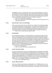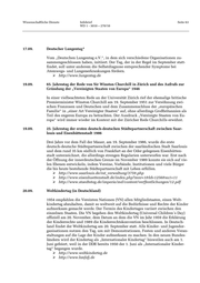 Wissenschaftliche Dienste Infobrief Seite 63 WD 1 - 3010 – 270/10 17.09. Deutscher Lungentag* Vom „Deutschen Lungentag e.V.“, in dem sich verschiedene Organisationen zu- sammengeschlossen haben, initiiert. Der Tag, der in der Regel im September statt- findet, soll unter anderem die Selbstdiagnose entsprechender Symptome bei Atemwegs- und Lungenerkrankungen fördern. http://www.lungentag.de 19.09. 65. Jahrestag der Rede von Sir Winston Churchill in Zürich und des Aufrufs zur Gründung der „Vereinigten Staaten von Europa“ 1946 In einer vielbeachteten Rede an der Universität Zürich rief der ehemalige britische Premierminister Winston Churchill am 19. September 1951 zur Versöhnung zwi- schen Franzosen und Deutschen und dem Zusammenschluss der „europäischen Familie“ in „einer Art Vereinigter Staaten“ auf, ohne allerdings Großbritannien als Teil des engeren Europa zu betrachten. Der Ausdruck „Vereinigte Staaten von Eu- ropa“ wird immer wieder im Kontext mit der Züricher Rede Churchills erwähnt. 19.09. 25. Jahrestag der ersten deutsch-deutschen Städtepartnerschaft zwischen Saar- louis und Eisenhüttenstadt 1986 Drei Jahre vor dem Fall der Mauer, am 19. September 1986, wurde die erste deutsch-deutsche Städtepartnerschaft zwischen der saarländischen Stadt Saarlouis und dem rund 35 km südlich von Frankfurt an der Oder gelegenen Eisenhütten- stadt unterzeichnet, die allerdings strengen Regularien unterworfen war. Erst nach der Öffnung der innerdeutschen Grenze im November 1989 konnte sie sich auf vie- len Ebenen entwickeln, indem Vereine, Verbände, Institutionen und viele Bürger die bis heute bestehende Städtepartnerschaft mit Leben erfüllen. http://www.saarlouis.de/rat_verwaltung/3759.php http://www.eisenhuettenstadt.de/index.php?mnr=1&Id=1256&su1=11 http://www.staedtetag.de/imperia/md/content/verffentlichungen/12.pdf 20.09. Weltkindertag (in Deutschland) 1954 empfahlen die Vereinten Nationen (VN) allen Mitgliedstaaten, einen Welt- kindertag abzuhalten, damit so weltweit auf die Bedürfnisse und Rechte der Kinder aufmerksam gemacht werde. Der Termin des Kindertages variiert zwischen den einzelnen Staaten. Die VN begehen den Weltkindertag (Universal Children´s Day) offiziell am 20. November, dem Datum an dem die VN im Jahr 1959 die Erklärung der Kinderrechte und 1989 die Kinderrechtskonvention beschlossen. In Deutsch- land findet der Weltkindertag am 20. September statt. Alle Kinder- und Jugendor- ganisationen nutzen den Tag, um mit Demonstrationen, Festen und anderen Veran- staltungen auf die Lage der Kinder aufmerksam zu machen. In den neuen Bundes- ländern wird der Kindertag als „Internationaler Kindertag“ bisweilen auch am 1. Juni gefeiert, weil in der DDR bereits 1950 der 1. Juni als „Internationaler Kinder- tag“ begangen wurde. http://www.weltkindertag.de http://www.bmfsfj.de