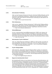 Wissenschaftliche Dienste Infobrief Seite 64 WD 1 - 3010 – 270/10 21.09. Internationaler Friedenstag 1981 von den Vereinten Nationen als Tag des weltweiten Waffenstillstands und der weltweiten Gewaltfreiheit proklamiert. Aufgrund einer Resolution der Vereinten Nationen im Jahr 2001 findet der Internationale Friedenstag seit 2002 jährlich am 21. September statt. http://www.un.org/events/peaceday 21.09. Welt-Alzheimertag 1994 von der „Alzheimer's Disease International“ (ADI) und der Weltgesundheits- organisation WHO initiiert. Der Welt-Alzheimertag soll die Öffentlichkeit auf die Situation der Alzheimer-Kranken und ihrer Angehörigen aufmerksam machen. http://www.deutsche-alzheimer.de 22.09. Weltschifffahrtstag* Von der „Internationalen Seeschifffahrtsorganisation“ (IMO), einer Agentur der Vereinten Nationen, initiiert. Er findet in der Regel an einem Tag in der letzten Septemberwoche statt. Mit dem Tag soll unter anderem die Bedeutung der Sicher- heit auf See und die Notwendigkeit des maritimen Umweltschutzes betont werden. http://www.imo.org 24.09. Internationaler Tag der Gehörlosen* 1951 vom „Weltverband der Gehörlosen“ (WFD) ins Leben gerufen und 1958 erst- mals durchgeführt. Seit Mitte der 1970er Jahre wird er als „Tag der Gehörlosen“ – in der Regel am letzten Samstag im September – auch in Deutschland begangen. http://www.gehoerlosen-bund.de 25.09. Tag der Zahngesundheit 1991 durch den „Aktionskreis Tag der Zahngesundheit“ initiiert, um einmal im Jahr bundesweit die Mundgesundheit ins Zentrum der öffentlichen Aufmerksam- keit zu rücken. International wird zudem auf Initiative des Weltzahnärzteverbands „World Dental Federation“ seit 2008 der „Welt-Mundgesundheitstag" (jährlich am 12. September) begangen. http://www.tagderzahngesundheit.de 25.09. Beginn der Interkulturellen Woche* Die Interkulturelle Woche ist eine Initiative der Deutschen Bischofskonferenz, der Evangelischen Kirche in Deutschland und der Griechisch-Orthodoxen Metropolie, die von Gewerkschaften, Wohlfahrtsverbänden, Kommunen, Ausländerbeiräten und Integrationsbeauftragten, Migrantenorganisationen und Initiativgruppen unter- stützt und mitgetragen wird. Sie findet seit 1975 jährlich Ende September von Sonntag bis Samstag vor dem Erntedankfest statt. Nach Empfehlung der Initiatoren soll die Interkulturelle Woche 2011 vom 25. September bis 1. Oktober stattfinden.