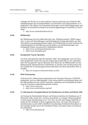 Wissenschaftliche Dienste Infobrief Seite 65 WD 1 - 3010 – 270/10 Anliegen der Woche ist es unter anderem, bessere politische und rechtliche Rah- menbedingungen des Zusammenlebens von Deutschen und Zugewanderten zu er- möglichen, zum Abbau von Vorurteilen beizutragen sowie durch Begegnungen und Kontakte im persönlichen Bereich ein besseres gegenseitiges Verständnis zu entwi- ckeln. http://www.interkulturellewoche.de 25.09. Weltherztag* Der Weltherztag wird seit 2000 jedes Jahr vom „Weltherzverband“ (WHF) organi- siert, in dem sich Herzstiftungen und kardiologische Fachgesellschaften aus über 100 Ländern zusammengeschlossen haben. Der Weltherztag soll unter anderem die Aufmerksamkeit der Bevölkerung auf die Risiken von Herzerkrankungen und Schlaganfall lenken und präventive Maßnahmen fördern. http://www.world-heart-federation.org http://www.herzstiftung.de 26.09. Europäischer Tag der Sprachen Aus dem „Europäischen Jahr der Sprachen 2001“ hervorgegangen und vom Euro- parat proklamiert, findet der Tag seit einigen Jahren jedes Jahr am 26. September statt. Der Europäische Tag der Sprachen zielt darauf ab, die Öffentlichkeit auf die Bedeutung des Sprachenlernens aufmerksam zu machen und ein Bewusstsein für die Vielzahl der in Europa gesprochenen Sprachen und ihren kulturellen Wert zu schaffen. http://ec.europa.eu/education/index_en.htm 27.09. Welt-Tourismustag 1979 durch die „Welttourismusorganisation der Vereinten Nationen“ (UNWTO) proklamiert und seit 1980 begangen. Unter einem jährlich wechselnden Motto soll die Öffentlichkeit auf die soziale, kulturelle, politische und wirtschaftliche Bedeu- tung des Tourismus aufmerksam gemacht werden. http://www.unwto.org http://www.world-tourism.org/wtd 27.09. 15. Jahrestag des Umzugsbeschlusses des Bundesrates von Bonn nach Berlin 1996 Auf Antrag der Bundesländer Bayern und Bremen beschloss der Bundesrat am 27. September 1996, seinen Sitz von Bonn nach Berlin zu verlegen. Damit korrigierte er seine eigene Entscheidung vom 5. Juli 1991, als sich eine knappe Mehrheit zu- nächst für den Verbleib in Bonn ausgesprochen hatte. Als neuen Sitz bezog die Länderkammer im Jahr 2000 schließlich das ehemalige Preußische Herrenhaus in der Leipziger Straße unweit des Potsdamer Platzes und damit mitten im Zentrum der Hauptstadt. http://www.bundesrat.de
